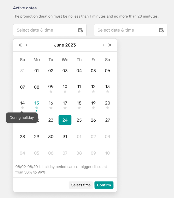 | 日期选择器:卖家在选择促销时限时可以看到条件日期。 | 已选条件日期:当促销时长和时间在条件日期内时。 | 未选条件日期:当促销时长和时间不在或仅部分在条件日期内时。 |