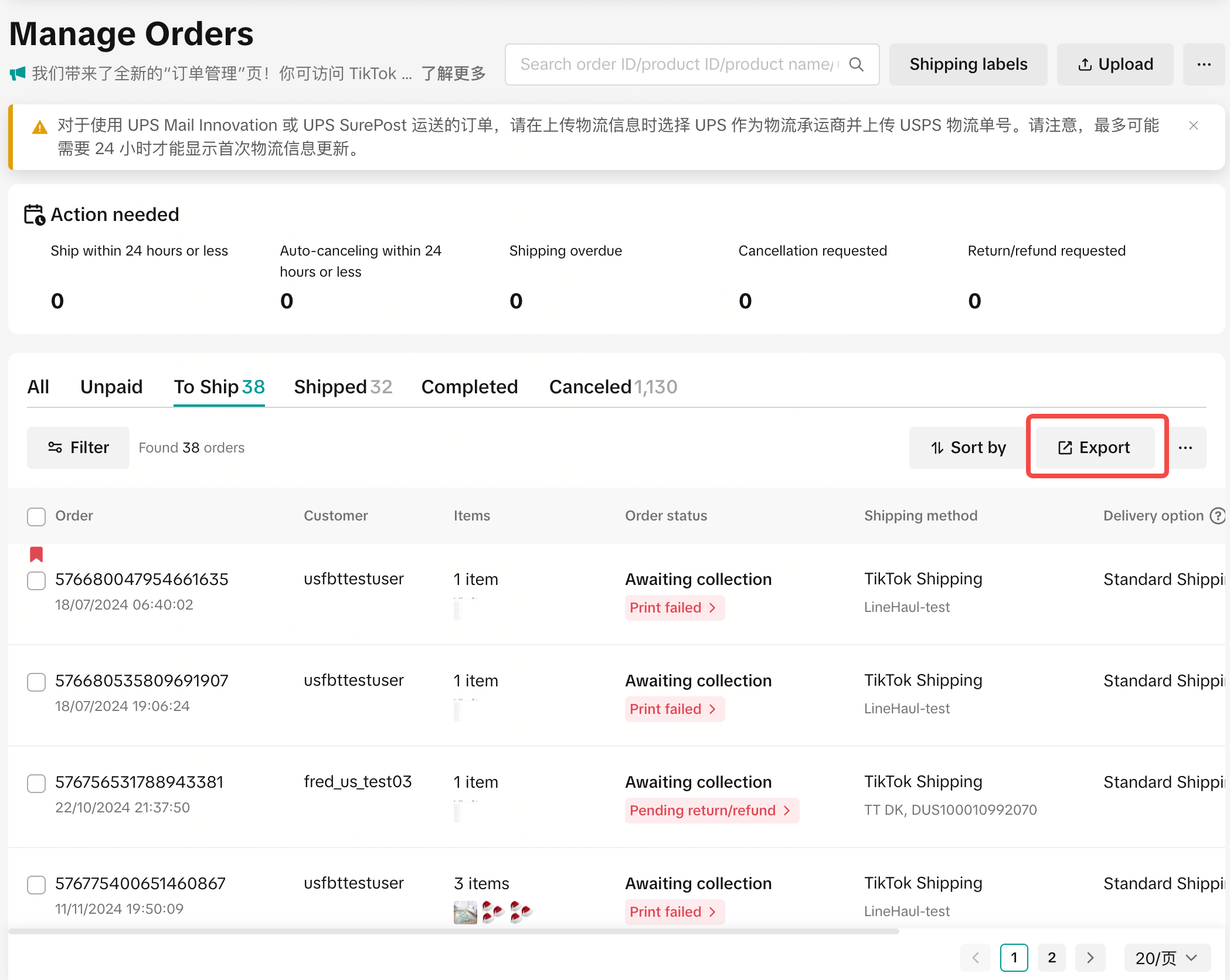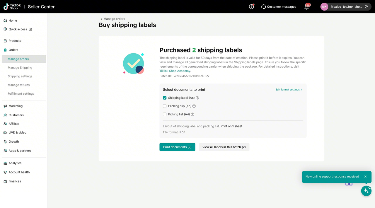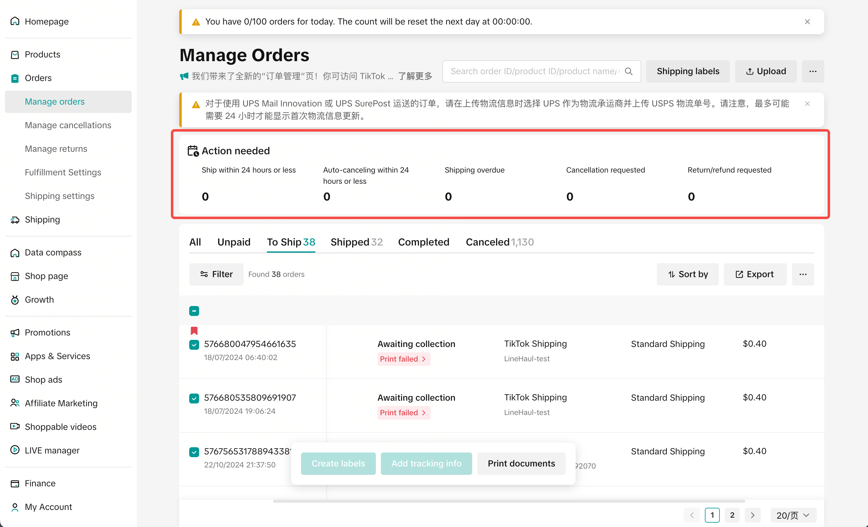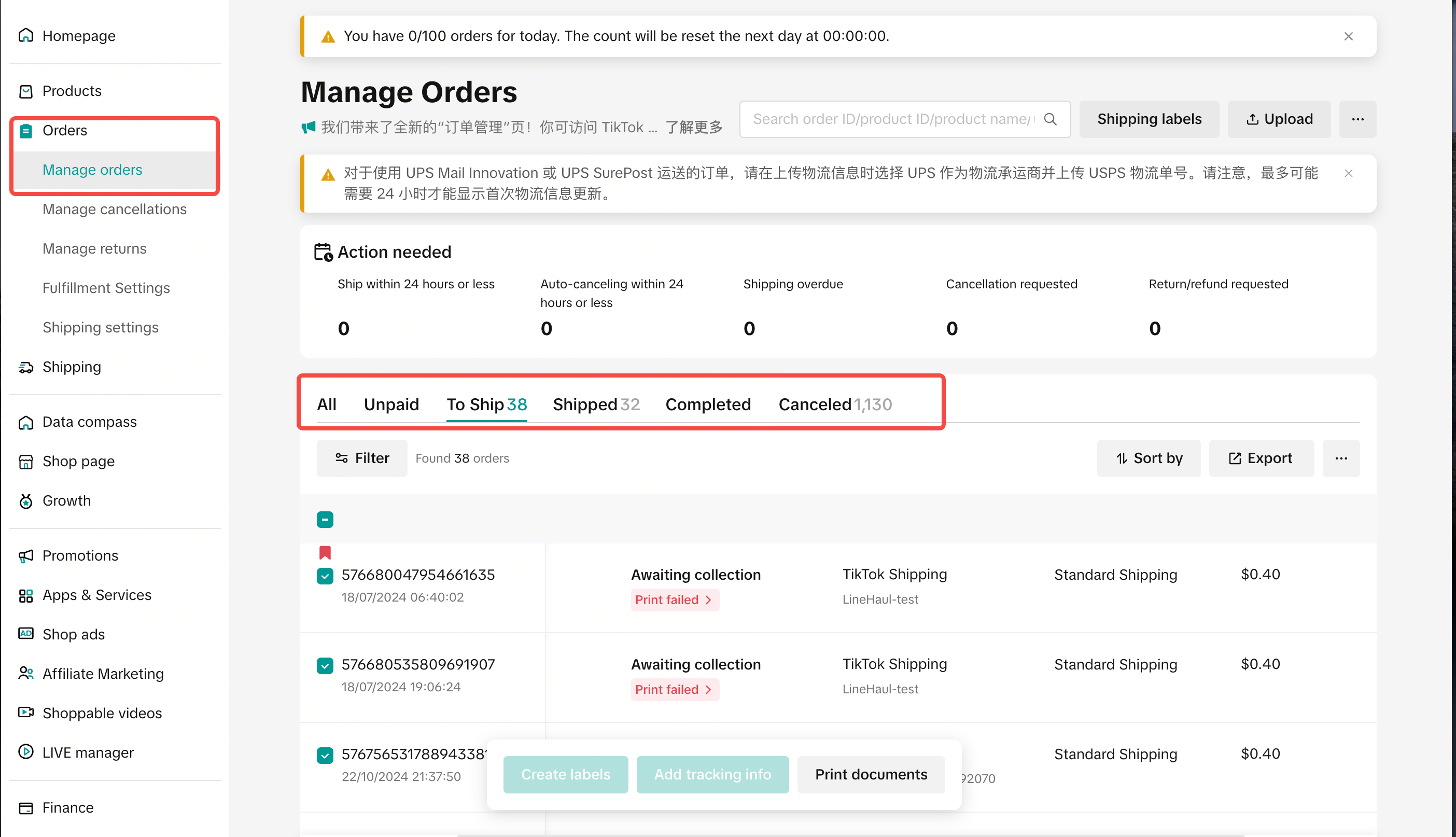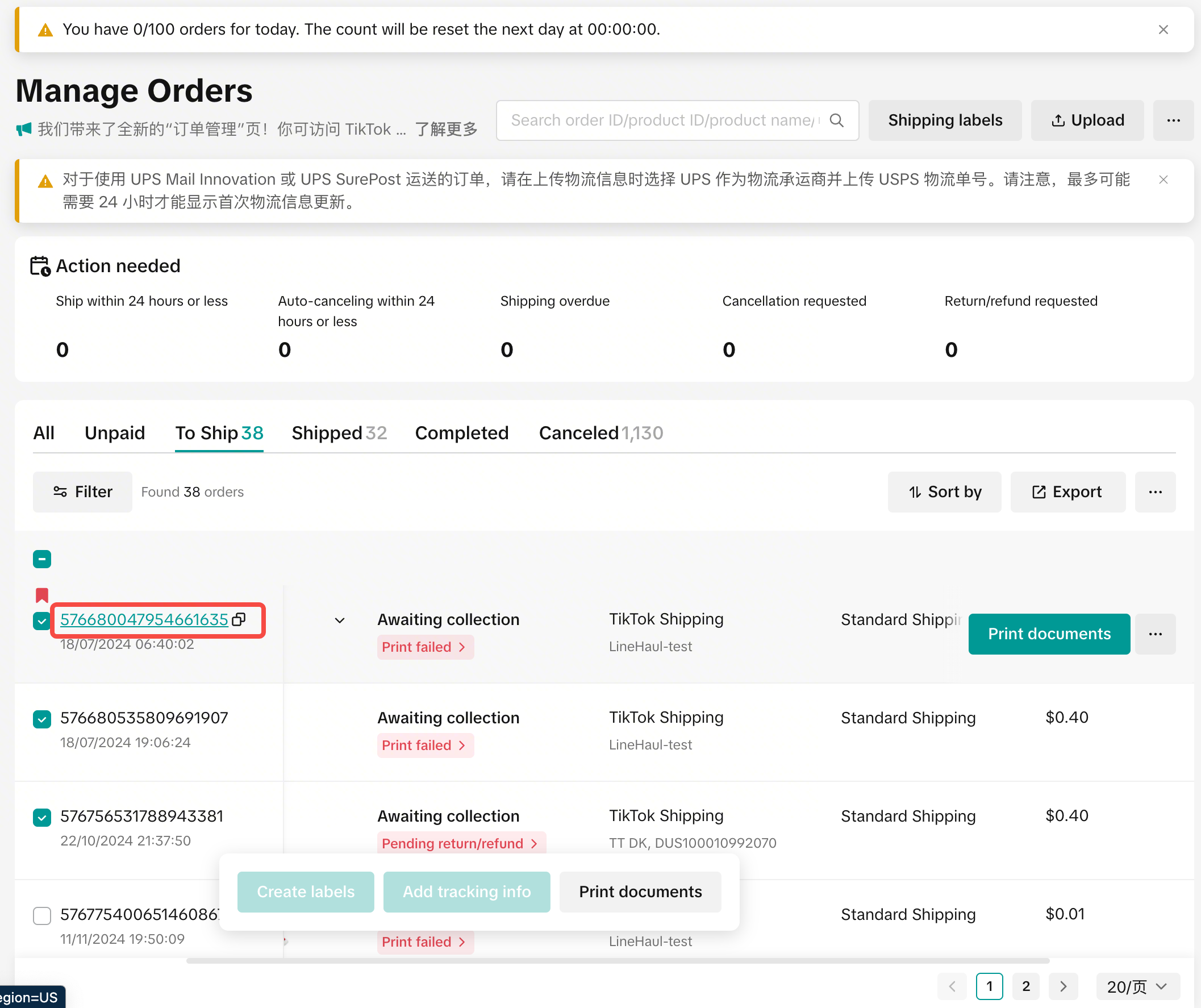 - 如需打印下一批物流面单,可以导航至“管理订单”页面,重复此前的所有操作。