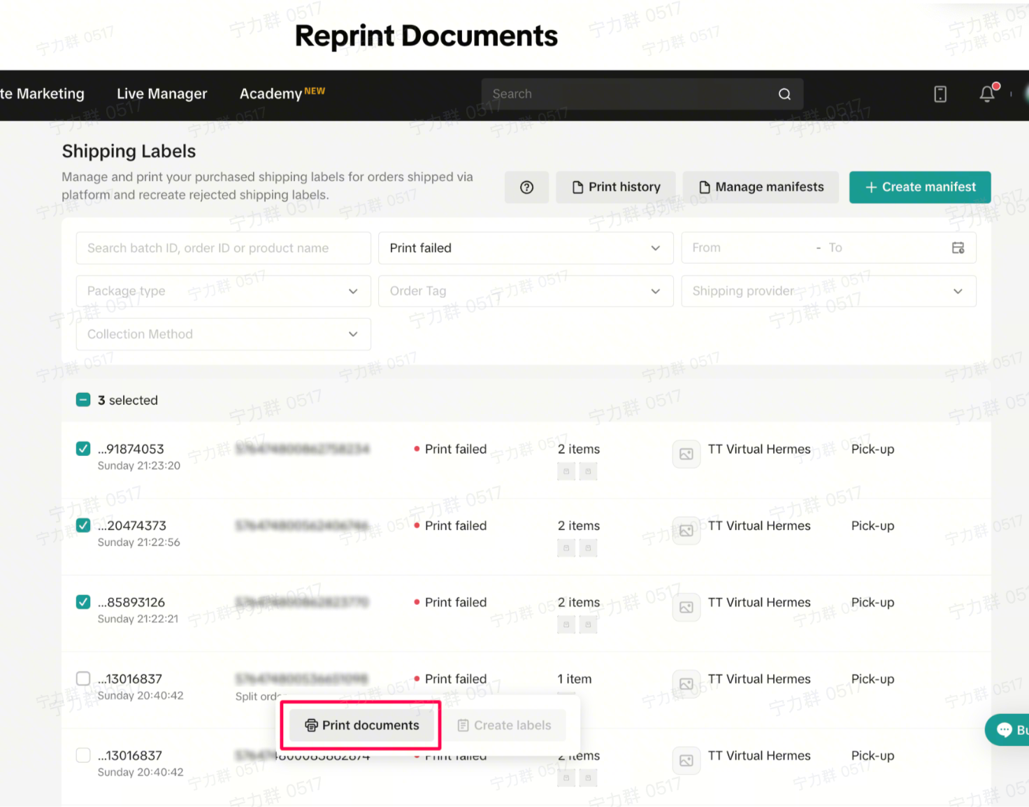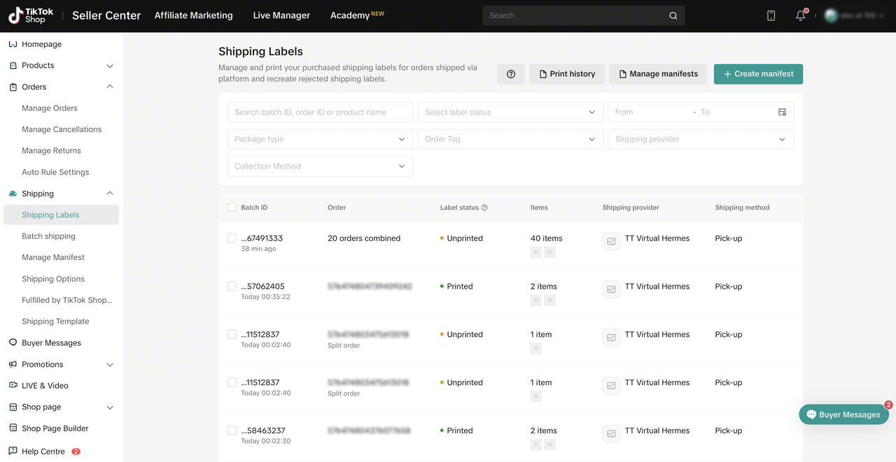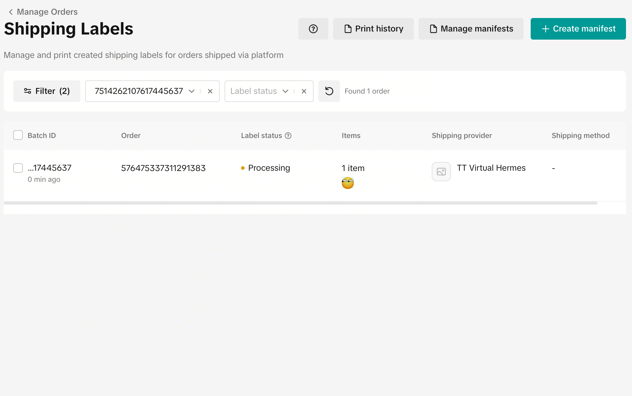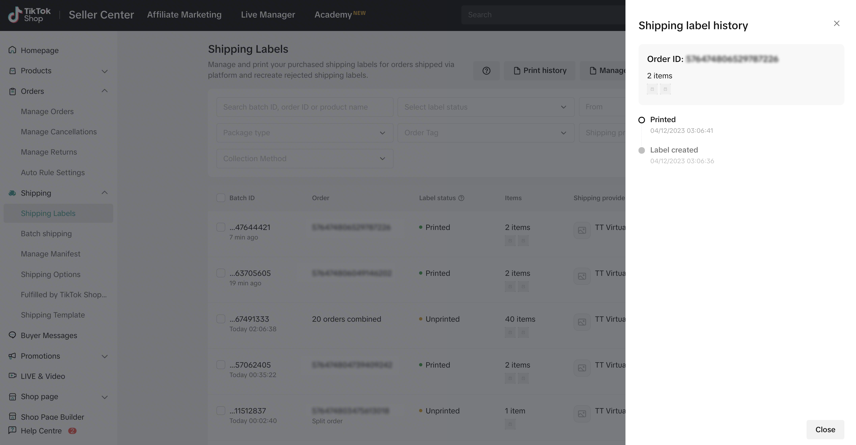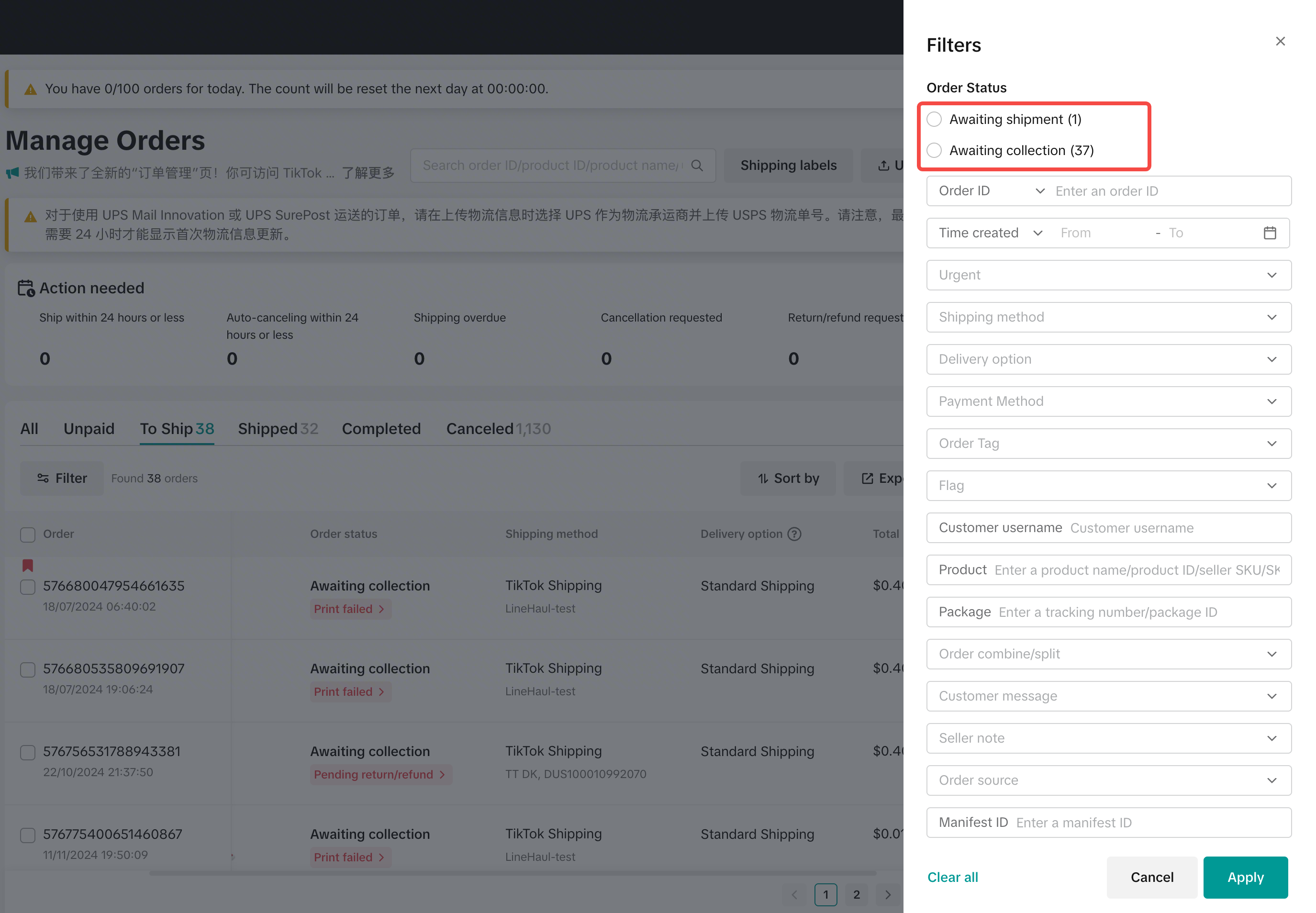 - 如需打印下一批物流面单,可以导航至“管理订单”页面,重复此前的所有操作。