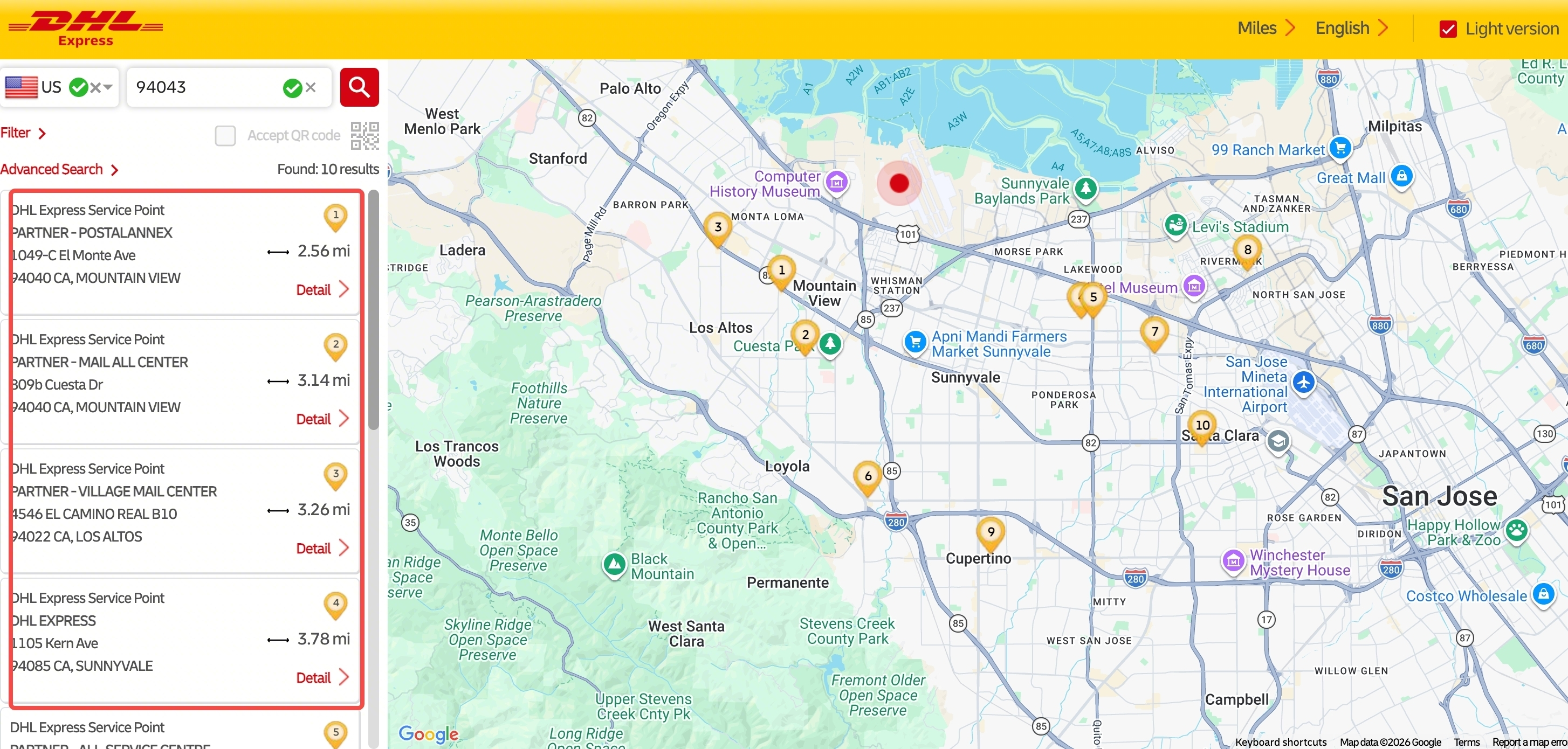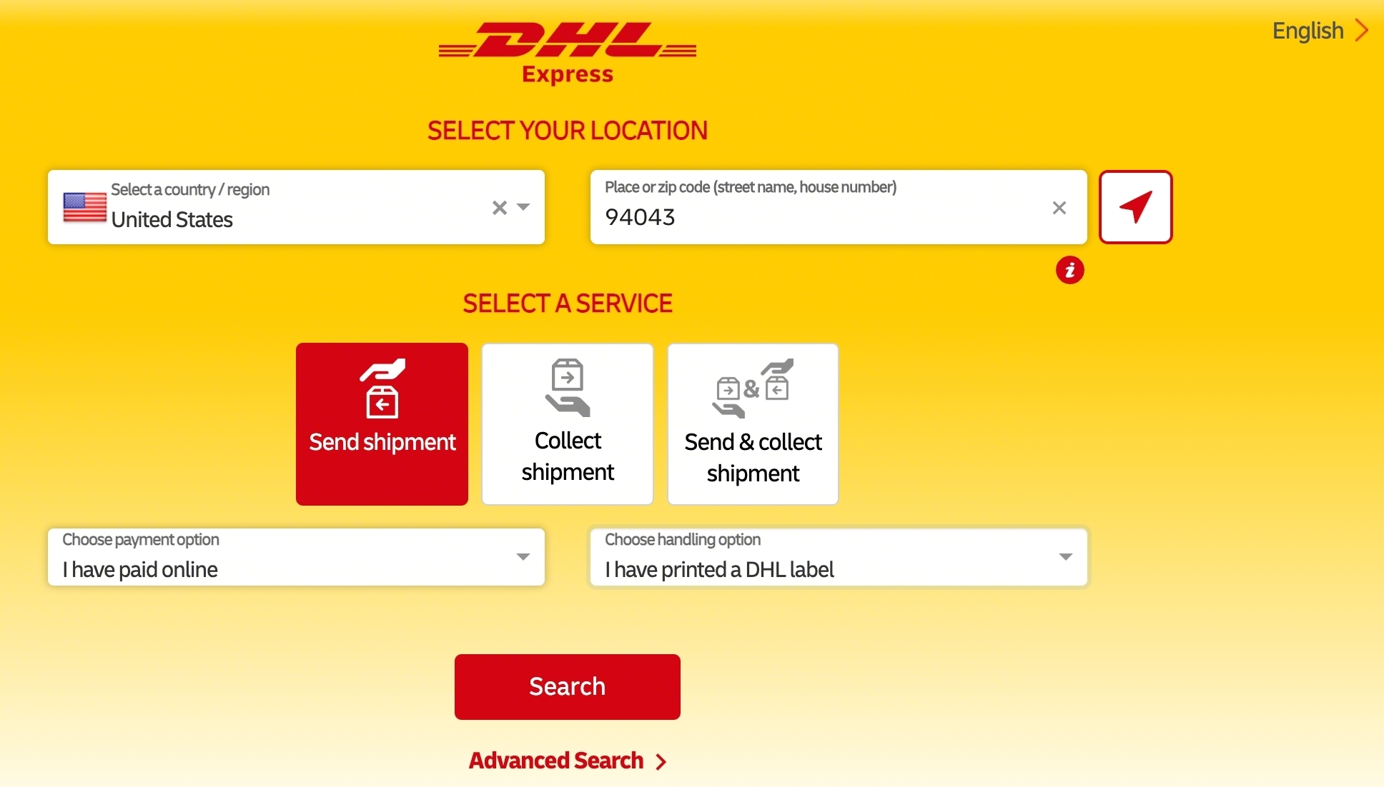 - 前往DHL线下投递点自行投递。您可以通过DHL的网站寻找离您最近的线下投递点(https://locator.dhl.com); 具体的查询方法如下: