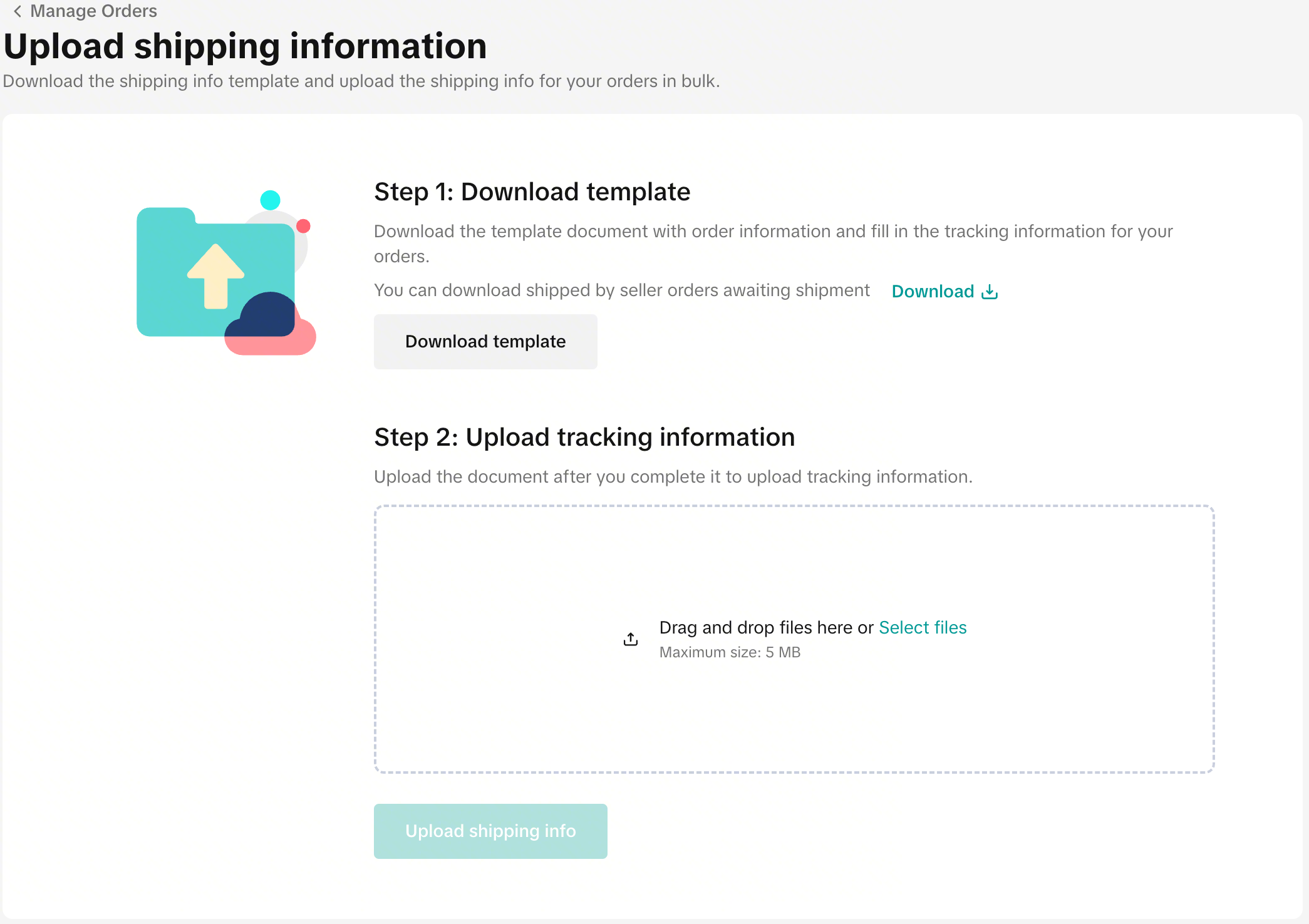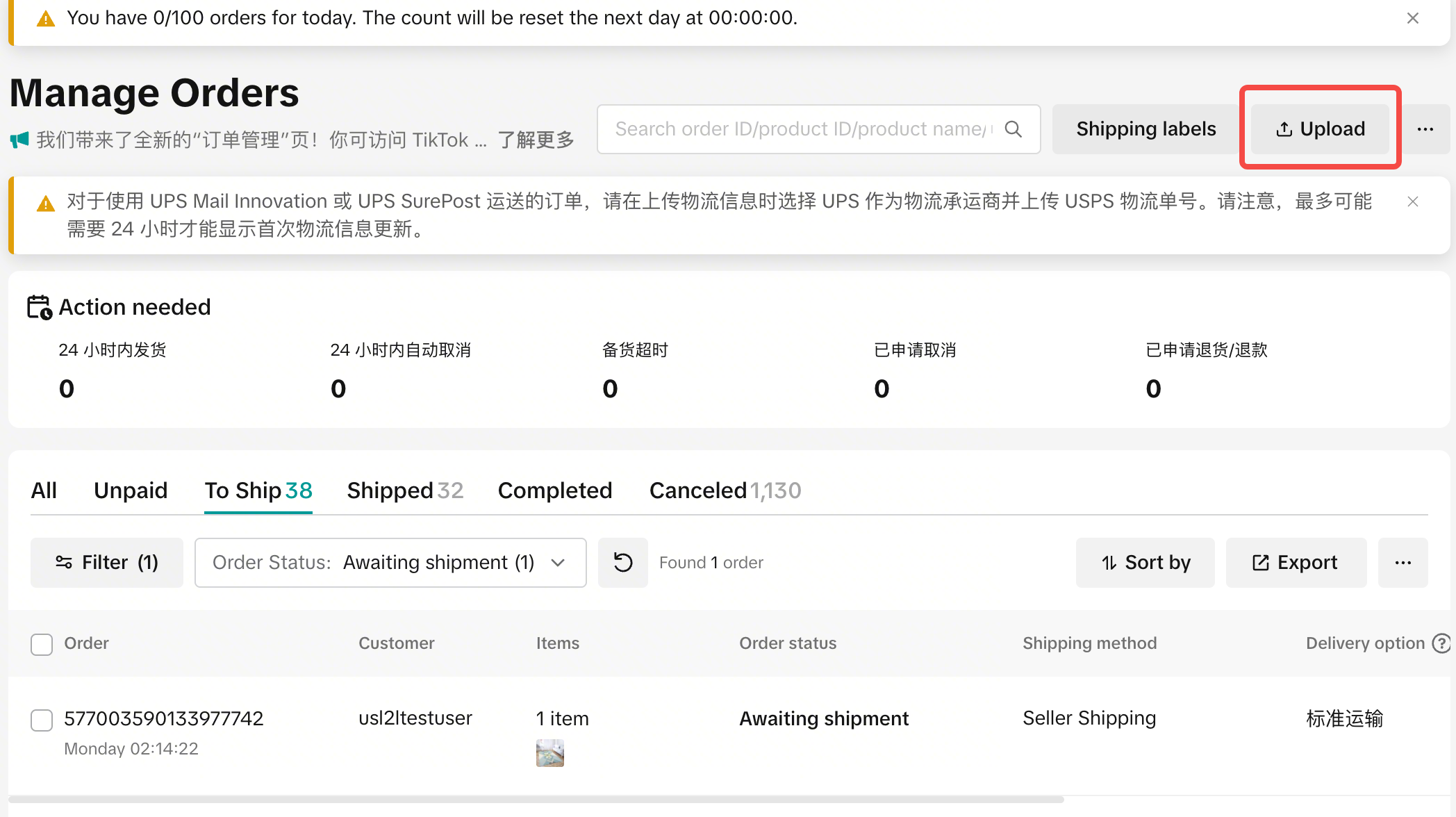- 批量发货:选择顶部的「上传」按钮来批量上传订单的物流信息