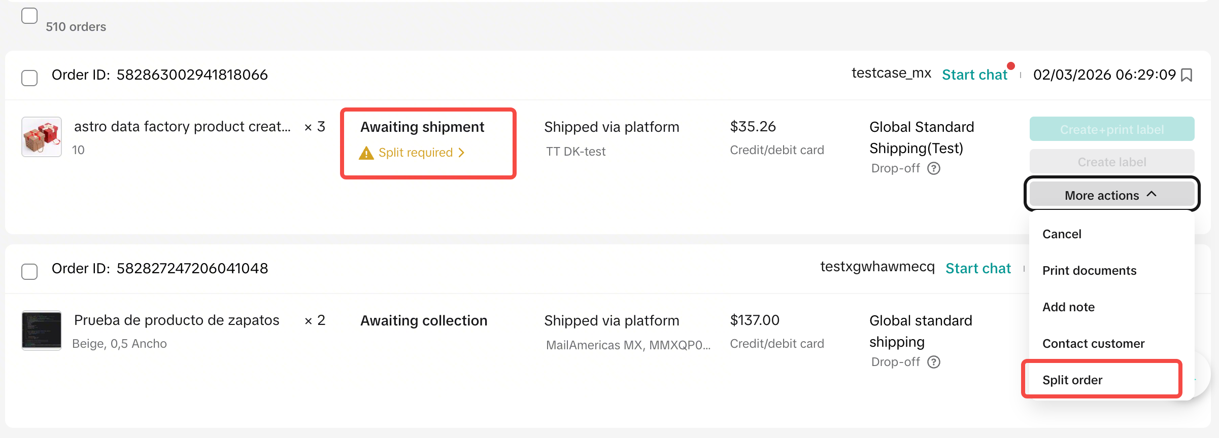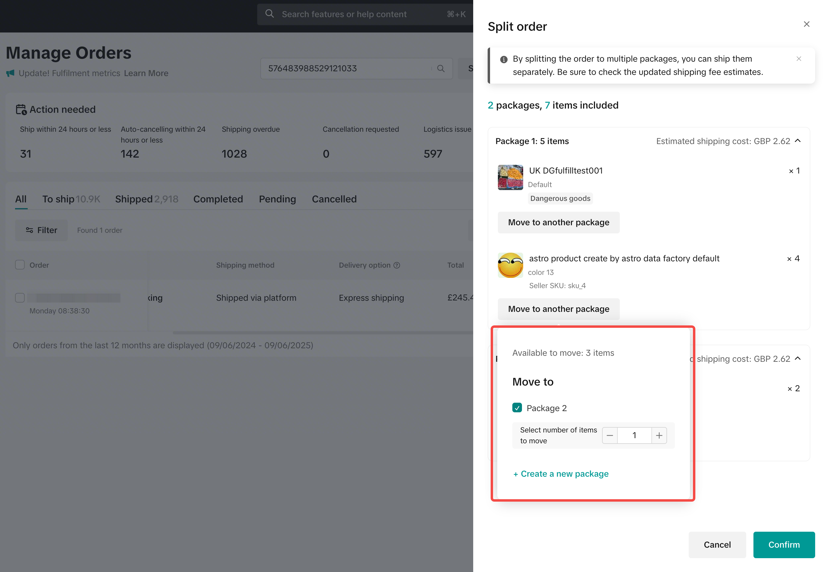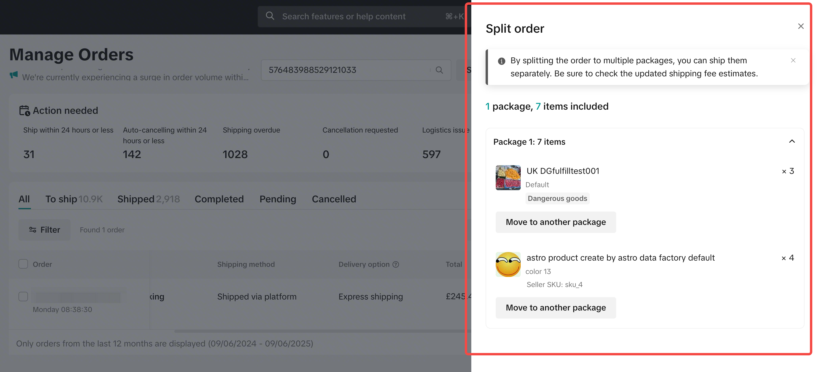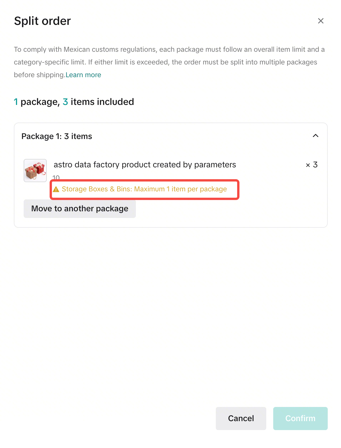 由于MX海关要求,平台基于命中类目限制的订单会要求强制拆包,订单上会增加必须拆包的标签,针对此部分的订单,商家必须拆包后才能发货选择想要进行拆包的订单。