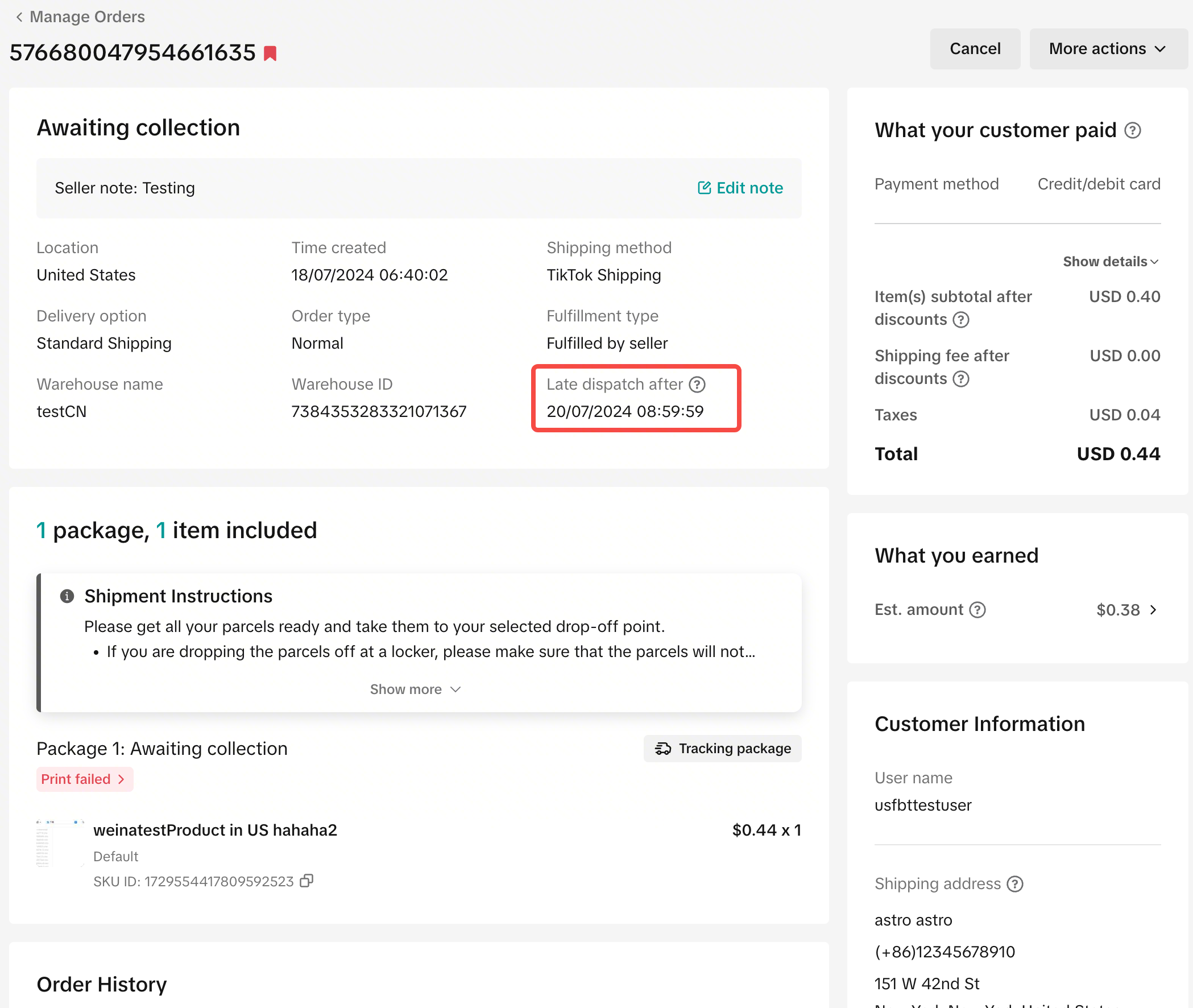 - 点击后系统打开新的跳转链接,可查看订单详情信息;发货期限是指需在该日期内确认发货。使用TikTok物流模式,需在发货期限内创建物流面单并标记发货;使用商家物流发货模式,需在发货期限内上传物流追踪号并标记发货