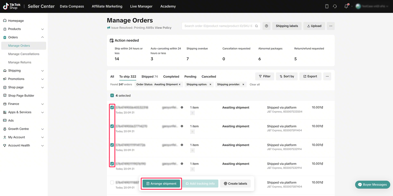 - 要打印物流面单,需先创建物流面单。只需在“管理订单”页面勾选单个或多个订单旁边的方框,然后点击“安排发货”。
