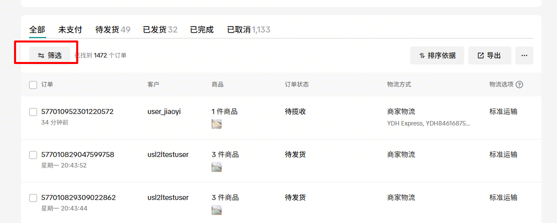 为获取更全面的搜索结果,请使用平台新升级的筛选功能,该功能可供商家选择并自定义不同的选项。只针对待发货和已发货的订单进行更细致的筛选