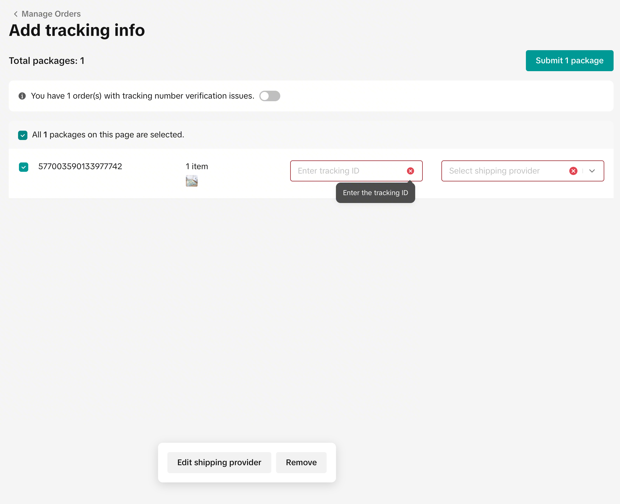 - 单笔或选择多笔订单发货,选择「添加物流信息」后填写物流单号及物流承运商