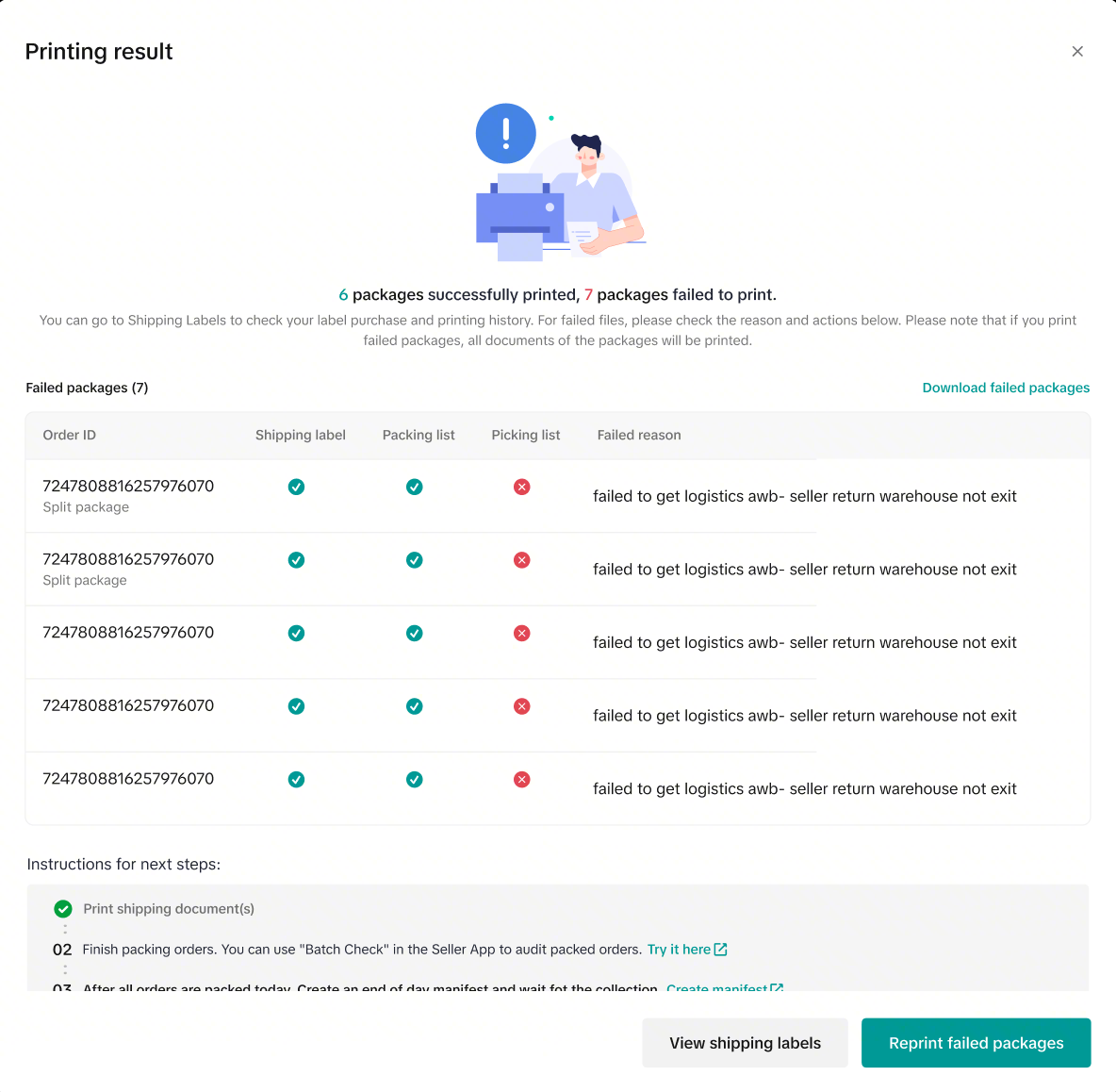 可以点击“重新打印失败的包裹”尝试重新打印,或选择“查看物流面单”了解更多信息。