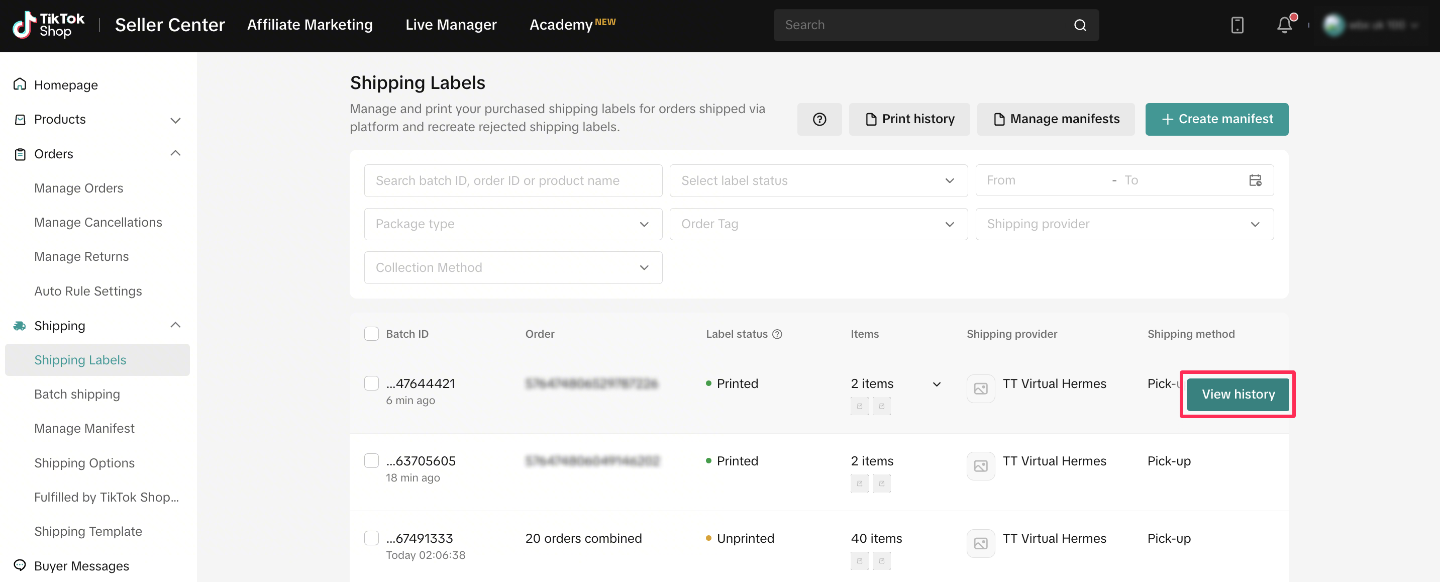 可以在“物流面单”页面轻松查看包裹详情,监控订单面单的状态或查看打印历史。只需执行以下操作: