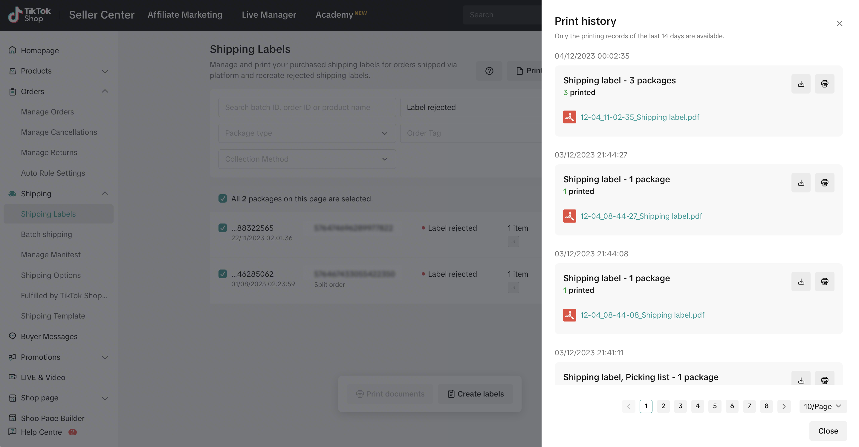- 通过该页面可以查看过去14天的打印记录,还能选择下载物流面单的PDF文件或再次打印。