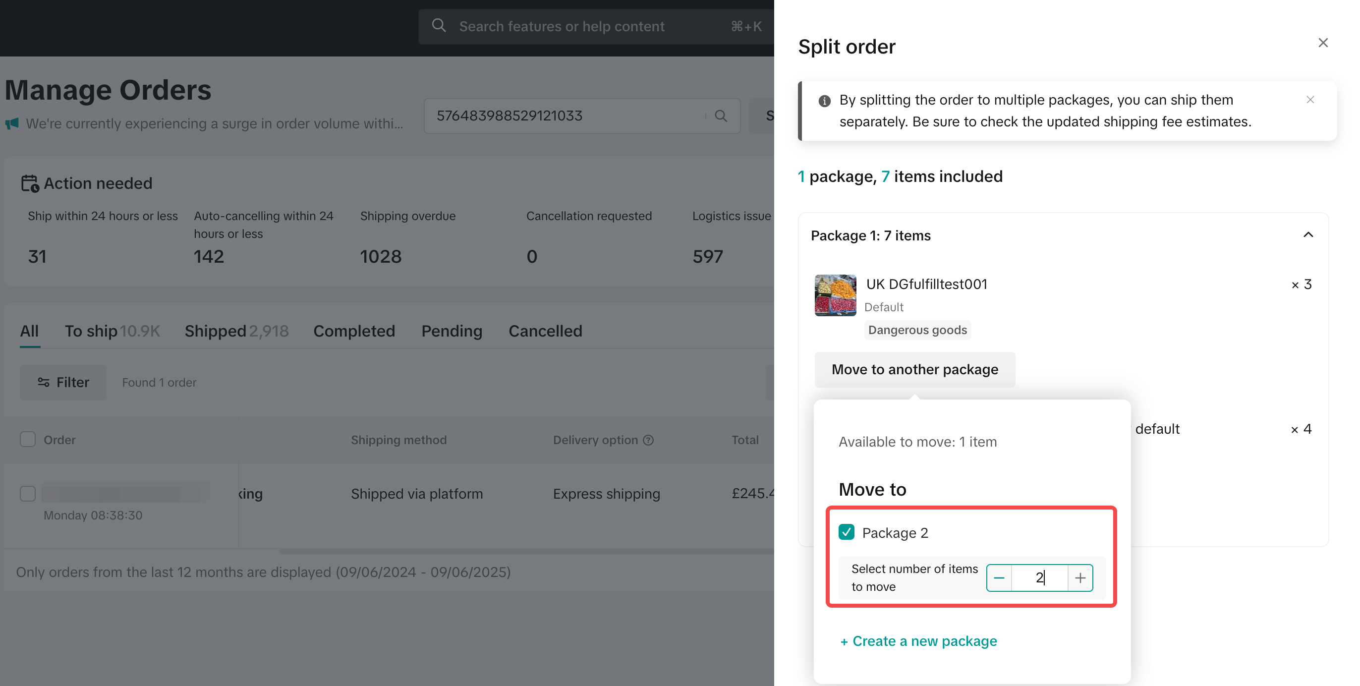 - 第一次操作时,需要先新建包裹;点击新建包裹后,出现输入商品数量按钮,需要输入期望添加到新包裹的商品数量;