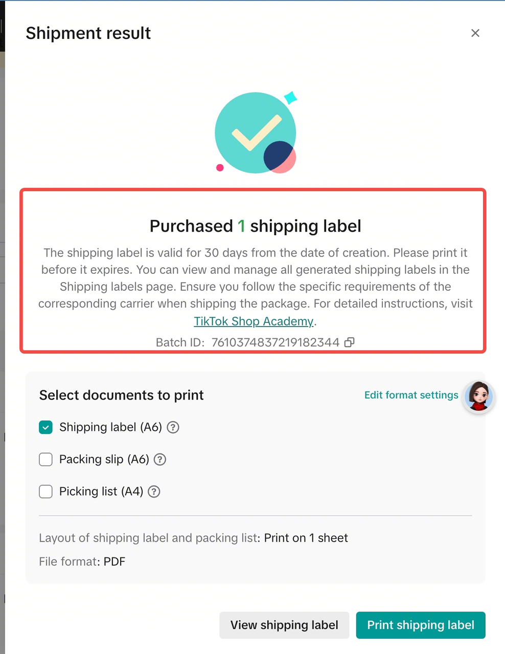 - 系统会自动生成物流面单。可以检查面单是否创建成功或是否存在问题。之后就能自由选择希望打印的具体文件了,包括物流面单、打包清单和拣货清单,还能选择文件格式和纸张大小。