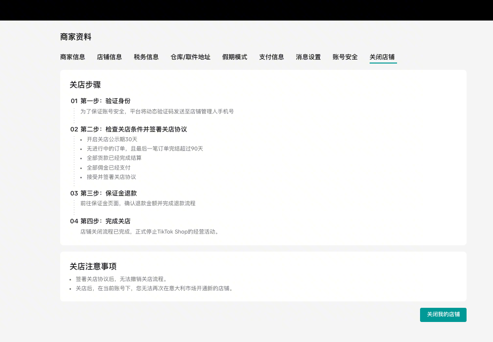 | 步骤六:关店成功 | 完成上述步骤后,店铺将被关闭,商家将收到关店成功的提示。 | | – 重要提示:在关店后,您会收到系统邮件;与您合作的达人也会受到站内信告知。 – 重要提示:关店后,在当前帐号下,您无法再次在欧盟市场开通当前国家新的店铺。如果想要再次在TikTok Shop经营,您可以重新创建一个新的账号,再次申请并完成欧盟的入驻流程。如果您想要使用同一个公司执照再次入驻开通第二个欧盟店铺,需要您的第一个欧盟店铺已经通过新店铺考察期。 |