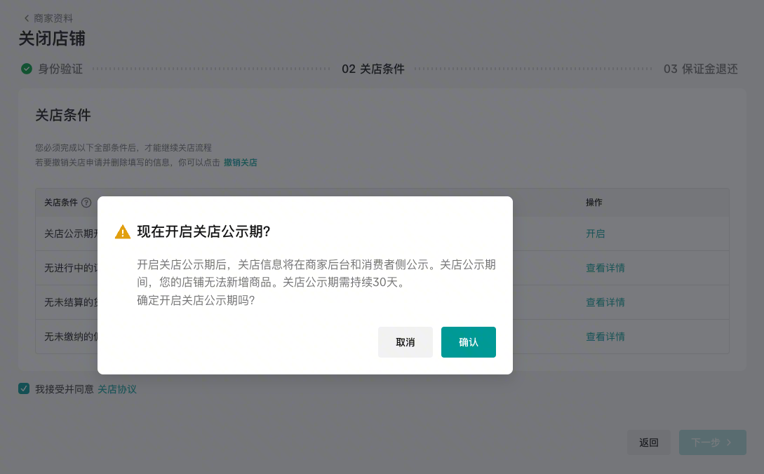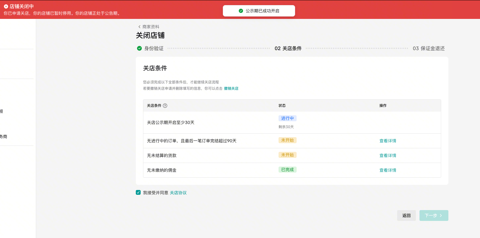 | 步骤四: 关店公示期 | 当店铺满足关店状态,且各项信息都满足;同时商家已点击接受关店协议,即可进行下一步,开始【关店公示期】 – 关店公示期持续30天 | ![]() ![]() ![]() ![]() | – 重要提示:开始关店公示期之后,您的店铺账号功能将受到限制,包含但不限于: 1. 商品:禁止发品、商品下架、存量商品不可编辑,审核中商品撤回 1. 活动:平台不可参与、已有平台活动下架、促销活动不可发起,已有促销活动停止 1. 交易:用户不可下单 1. 广告:不可投广、已有广告投放停止 1. 联盟:不可设置公开计划、不可设置定向计划、所有计划停止、不可搜索达人等 |