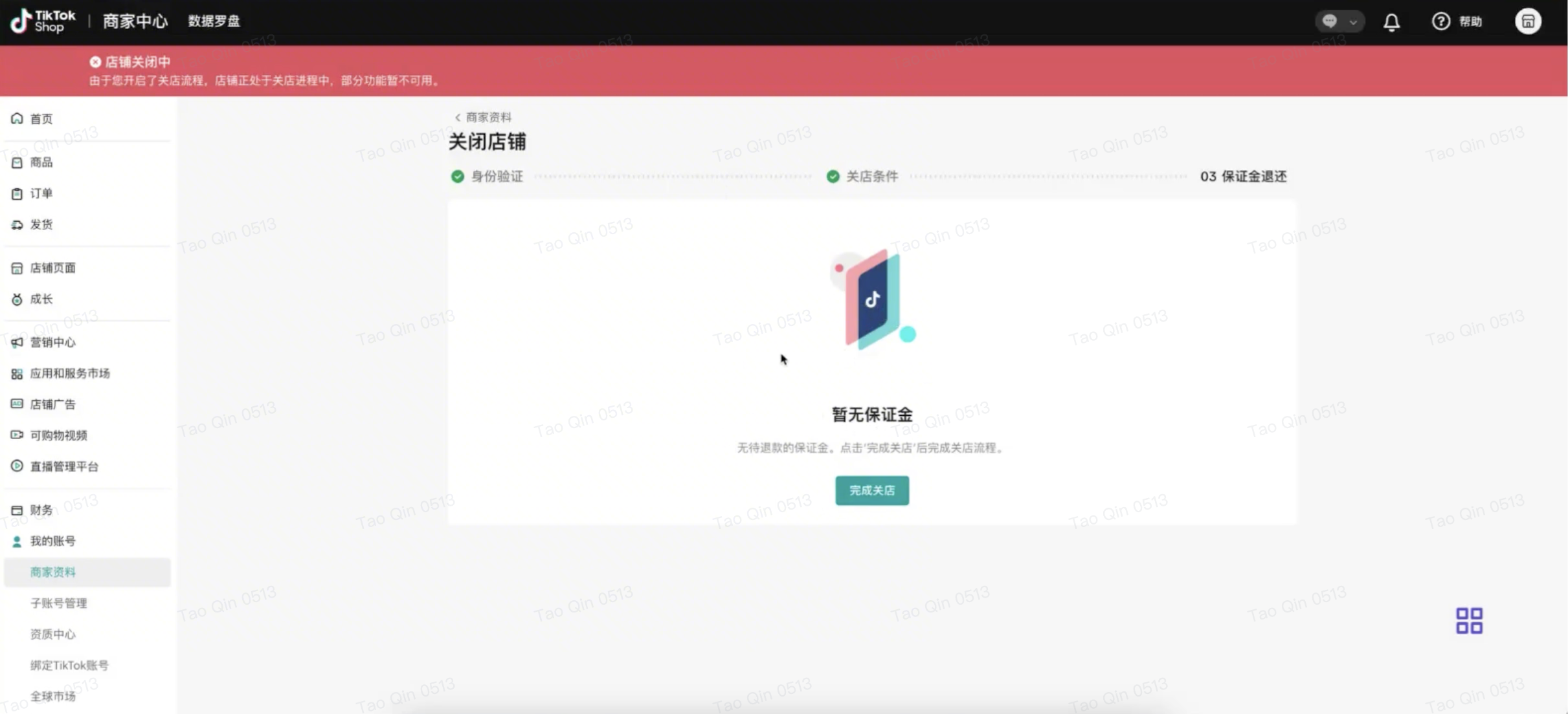 | 步骤三: 确保店铺关闭条件均已满足 | 要使店铺关闭申请获得批准,商家必须满足以下条件: – 开启关店公示期30天 – 无进行中的订单,且最后一笔订单完结超过90天 – 全部货款已经完成结算 – 全部佣金已经支付 – 接受并签署关店协议 – 商家可以在[关闭店铺]页面查看这一步骤的进展。 – 检查所有信息无误且完成状态后,商家可点击勾选-接受并同意关店协议 此时也可在左上角点击【撤销关店】 | ![]() ![]() | – 重要提醒:当订单、结算或佣金等不满足关店要求时,需前往对应功能页面完成相关操作或信息查看,使满足关店的条件。 – 重要提示:如果TikTok Shop因店铺余额为负数而无法结清欠款,TikTok Shop可使用店铺保证金中的资金来结清欠款。 |