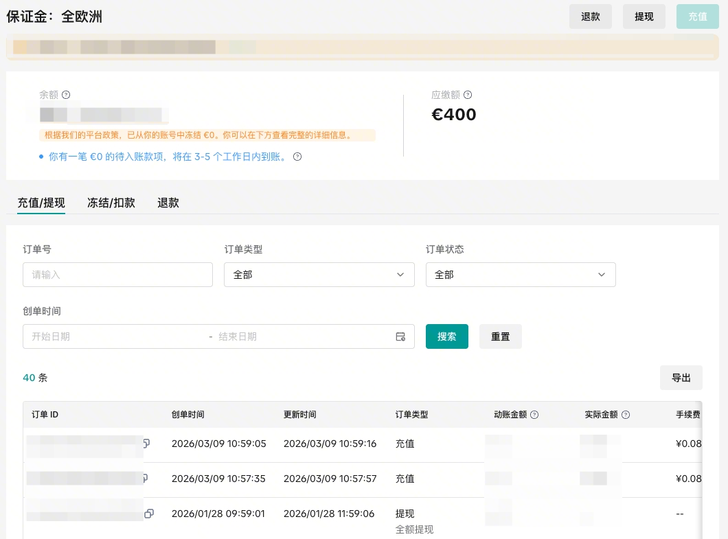 若您对保证金余额存疑,可以通过【商家后台-资金-保证金账户】查看保证金金额变化。可参考规则跨境店铺保证金规则(欧盟)。