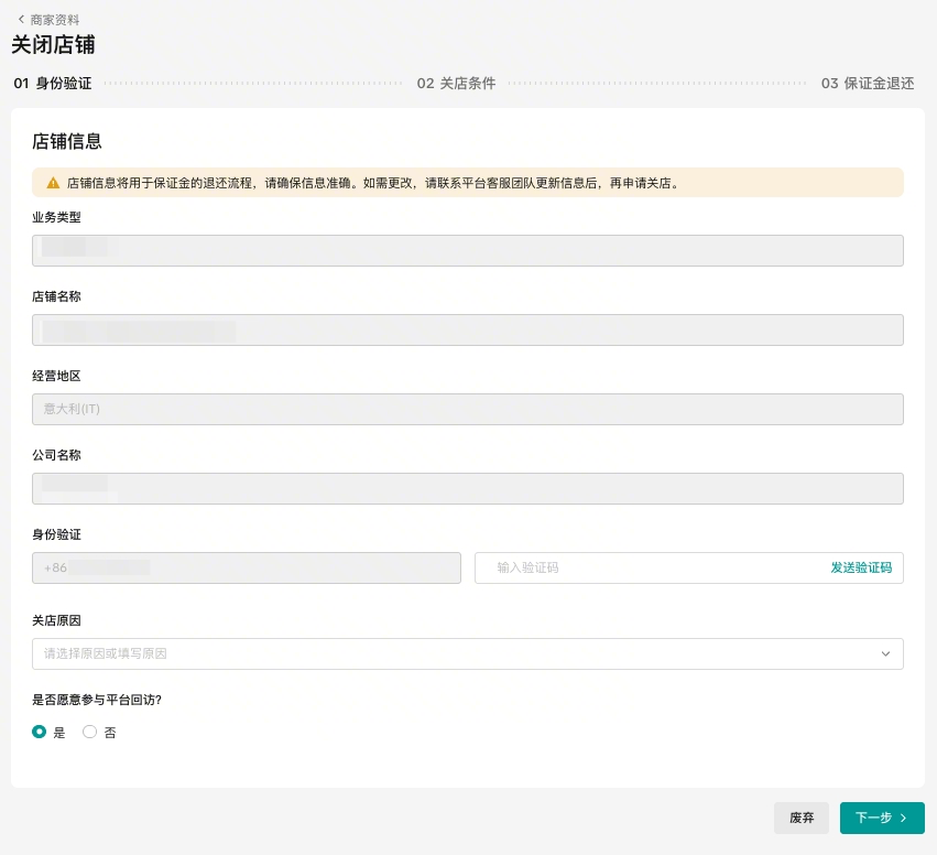 | 步骤二:核验店铺/商家信息 | 在申请关闭店铺时,商家必须核实其身份信息。这些信息包括: – 业务类型 – 店铺名称 – 经营地区 – 公司名称 如果这些信息有任何遗漏或不正确,商家必须更新或添加正确信息,以便进入下一步。 | ![]() ![]() | – 重要提醒:店铺信息将用于保证金的退还流程,请确保信息准确。如需更改,请联系平台客服团队更新信息后,再申请关店。 |