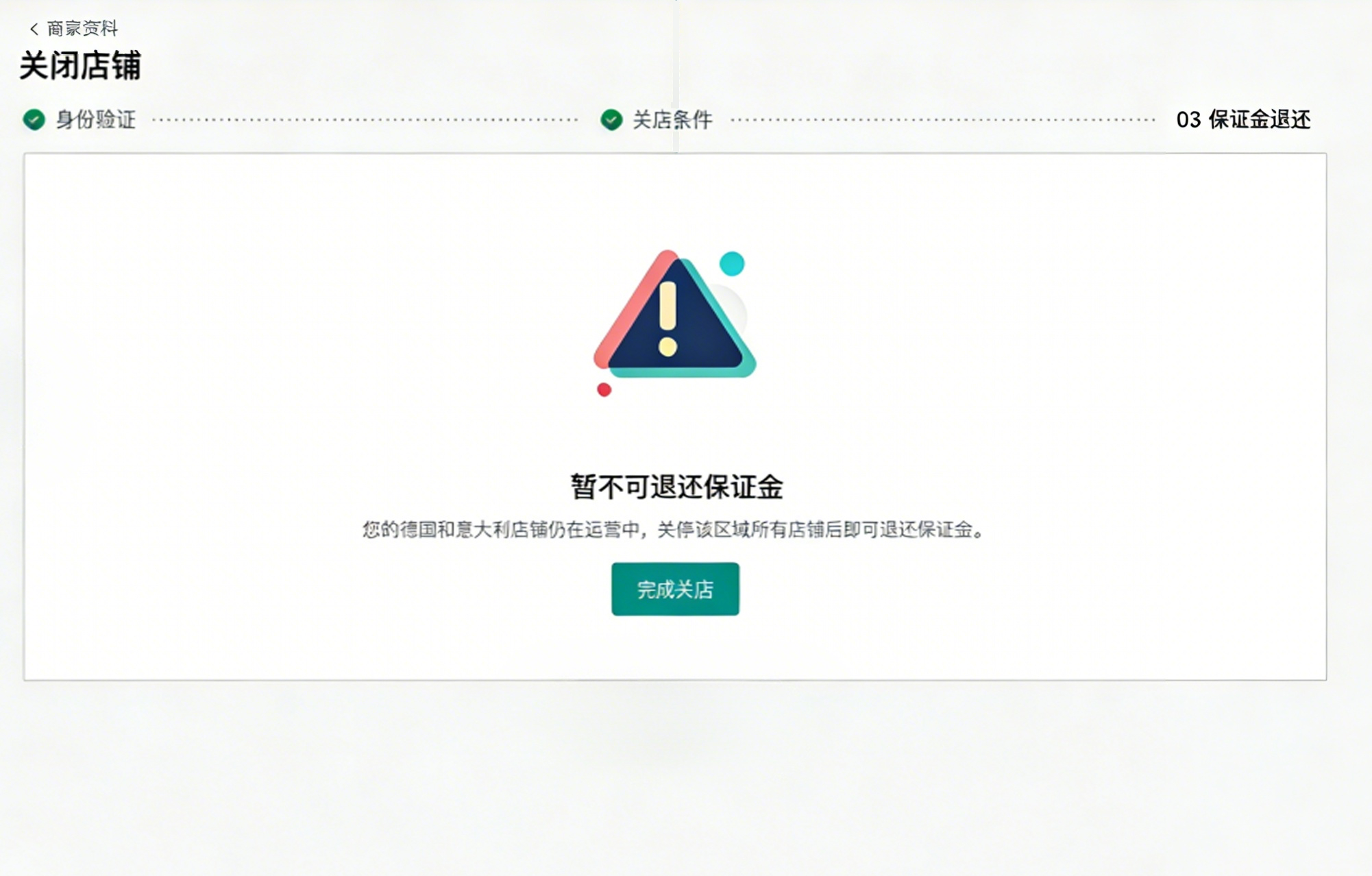 | 步骤五:保证金退还 | 当前欧盟账号下所有店铺均完成前面关店任务后,才可进行保证金退还步骤。 – 当保证金=0,且没有进行中的交易时可直接关店 – 若保证金>0 需跳转至保证金界面操作退款,申请退款后预计3~5天可退款完成。只有等待退款完成,才能满足关店条件,可操作最后一步关店。 | – 若您的欧盟账号下存在未完成关店任务的店铺,您无法进入保证金提现流程![]() ![]() – 无保证金:该步骤已完成 ![]() ![]() – 有保证金且欧盟的所有店铺均已完成关店任务:跳转到保证金页面,点击“提现”确定金额后,进入到提现流程 ![]() ![]() | – 重要提示: – 只支持对公和对私银行账户提现,且只能提现到与企业主体名称一致的对公银行账户,或与法人名称一致的对私银行账户 – 若法人信息在PIPO入驻信息有缺失,则只能提现到与企业主体名称一致的对公银行账户。 |