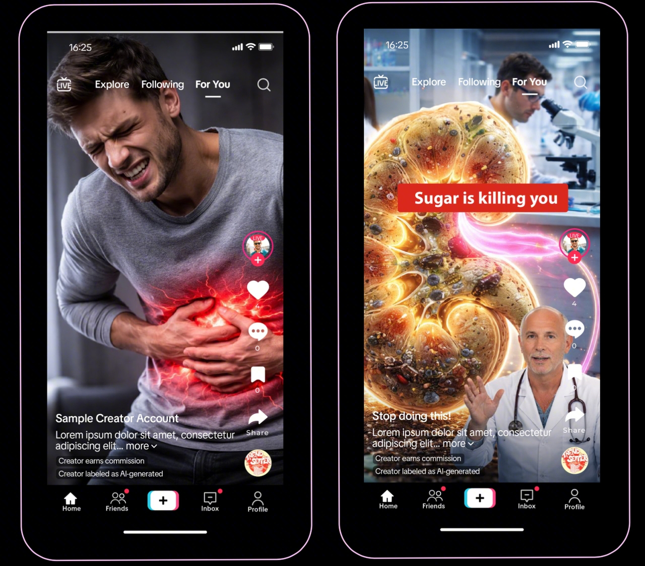 这包括使用身着制服/手术服的虚拟形象,以此误导消费者以为商品获得了医疗“背书”,以及使用恐吓性话语,如警告用户如不购买商品将面临严重后果。此类做法会产生误导,引发不安全的错误认知,并造成现实世界的危害。