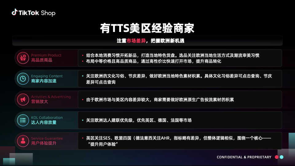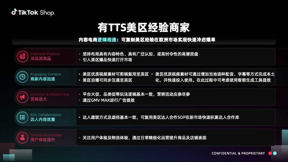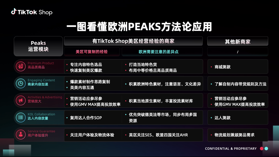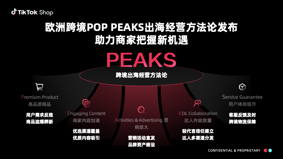 在跨境电商出海浪潮中,欧洲市场机遇与挑战并存。TikTok Shop推出欧洲跨境 POP PEAKS 出海经营方法论,以高品质商品(Premium Product)、内容营销(Engaging Content)、营销放大(Activities & Advertising)、达人合作(KOL Collaboration)、服务保障(Service Guarantee)五大维度,为商家拆解增长路径,助力把握欧洲市场新机遇,开启跨境出海经营新篇 。