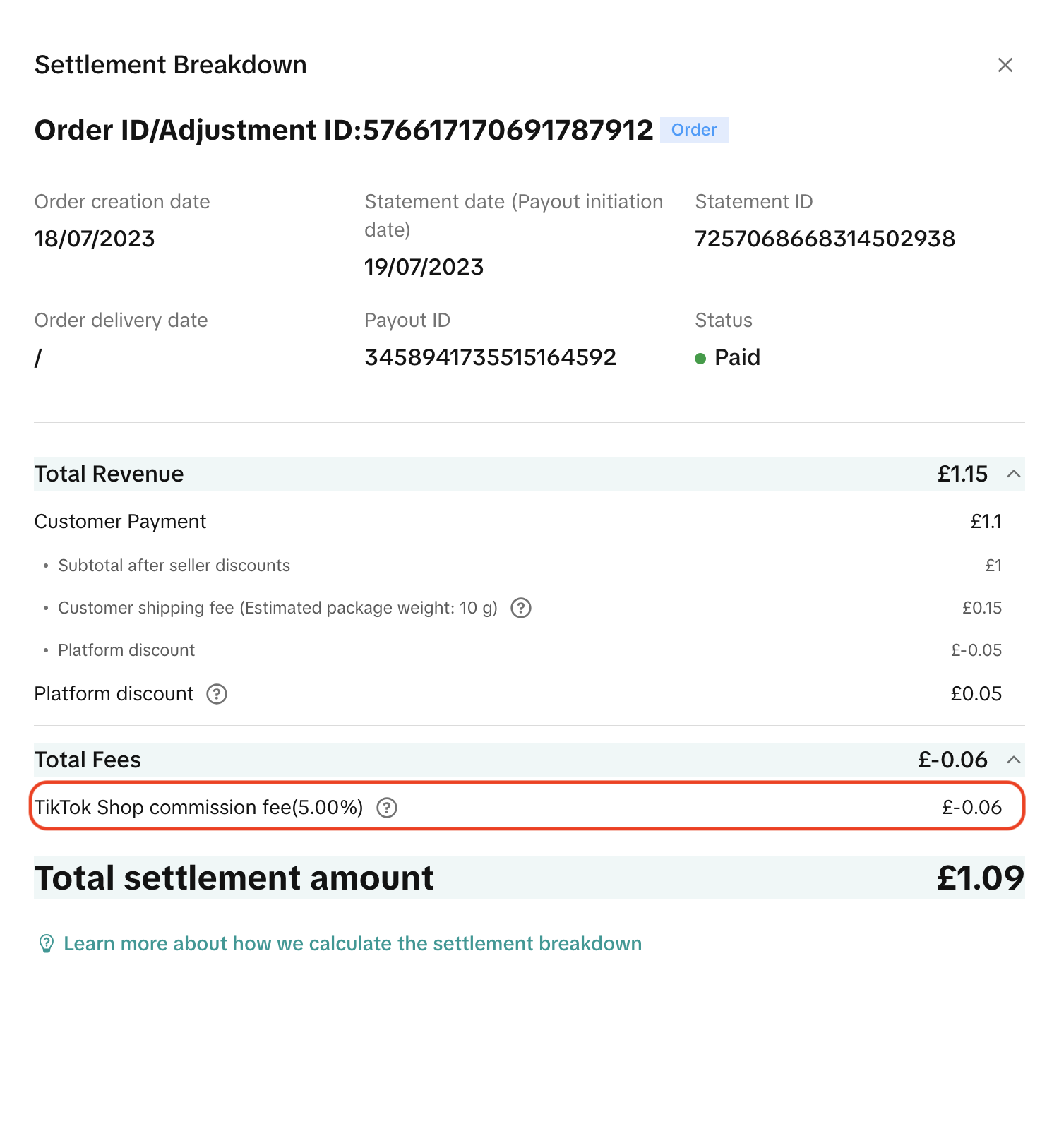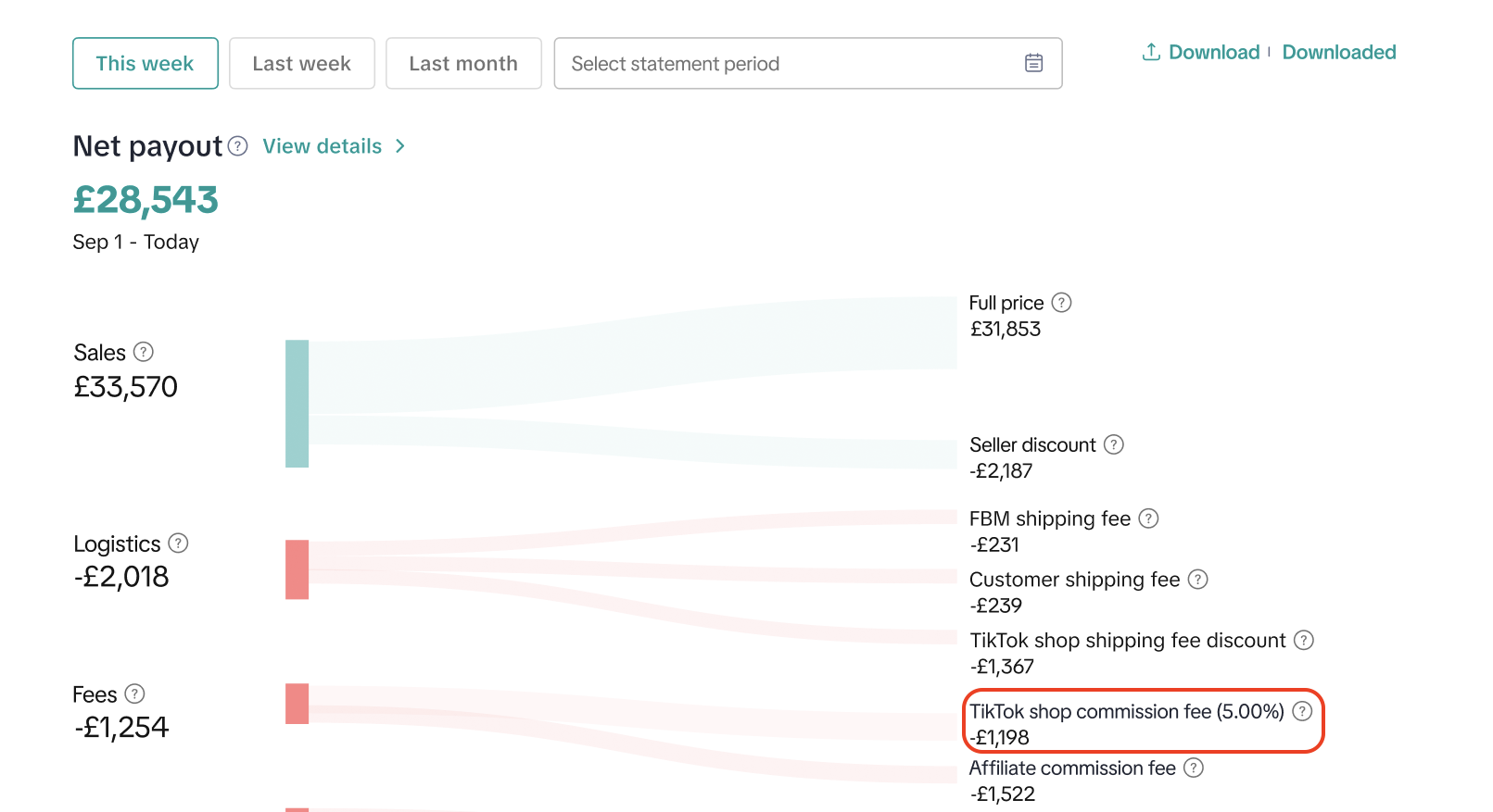 商家可以在“费用”分组里的“TikTok Shop佣金费”部分查看具体佣金费。查看汇总数据:商家中心 > 财务 > 财务总览;查看每笔交易的费用:商家中心 > 财务 > 总览 > 结算。