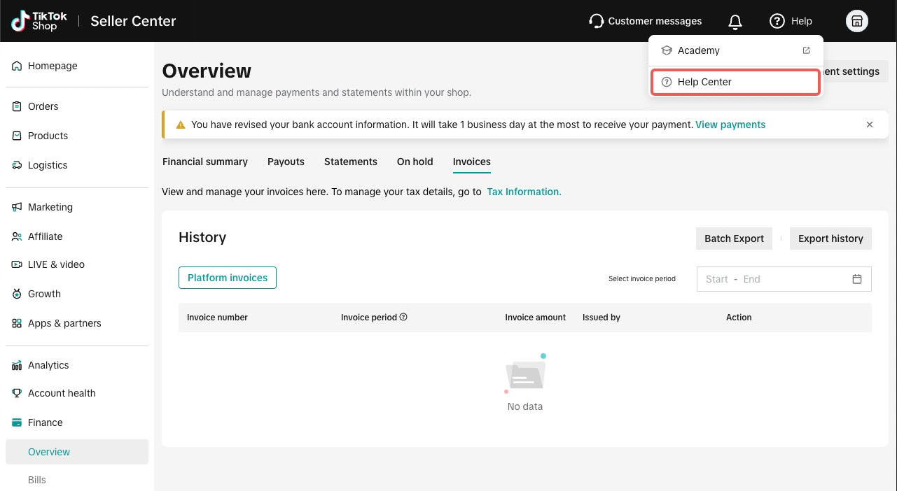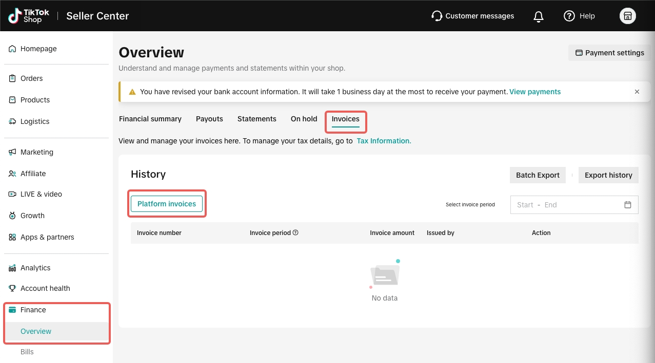 商家会在次月收到上月账期的发票。下载发票可前往:商家中心 > 财务 > 总览 > 发票 > 平台发票。