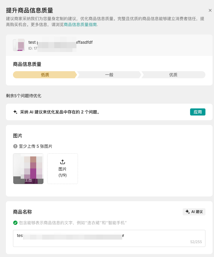 系统会根据您录入的商品信息和同品类商品对齐,给出商品详情的信息质量评分。分为低质、一般、优质三挡。并且系统集成AI诊断能力,您可应用AI建议来优化产品