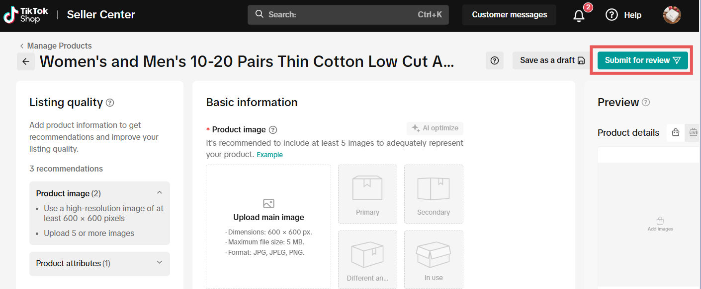 | 基础信息 | 商品图片&名称&类目 | – 自动翻译:新版发品支持使用中文或英文或当地语言发品,当商品推送给对应市场的时候,系统会自动翻译成当地语言。 – 发品质量:系统会根据您录入的信息自动监测发品质量,发品质量等级表示发品信息的质量。等级越高,表示客户体验越好,页面浏览次数越多。 – 预览:实时从消费者视角预览您的商品信息,优化信息。 – 图片:尺寸:600 × 600 像素。文件大小上限:5 MB(最多 9 个文件)。格式:JPG、JPEG、PNG 可使用系统AI工具的背景生成器轻松更改照片背景,优化商品图片。 – 商品名称:请录入商品名称,系统会自动翻译为英文。包含品牌、用途、类型和商品功能。如果你要使用品牌名称,则需要授权。 – 类目:选择您的商品对应的类目,要选择至末级类目。商品分类错误、禁售或限售的发品将被移除,您的商家账号也可能受到影响,请谨慎选择。 1. 不同国家域的店铺可经营的商品类目是不相同的,请以系统展示信息为准。或参考商家大学规则指南。 2. 商品类目必须和店铺主营类目相同;如果不同则不允许发布;如果需要修改店铺主营类目,请跳转至:我的账号-资质中心-类目资质 模块修改。但在 6 个月内一次只能更改一个类目。请下架该类目下的所有商品,然后再更改类目。 | ![]() ![]() |