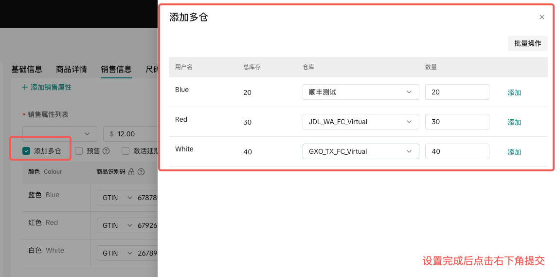 | | 销售信息-多国多仓 | – 多SKU管理界面升级-支持调整变体列宽,变体管理体验更加友好。支持全屏管理,支持批量录入SKU信息或批量一品多仓管理库存。![]() ![]() ![]() ![]() – 新建商品时可以直接给多国店铺铺品 – 核心需设置新国家市场的商品价格、总仓库库存和补充信息。如果对应市场有涉及额外的商品合规属性需要补充,需点击查看,完善合规信息。 例如:US店发品时需要同步发送至法国店铺,需要针对法国单独设置物流信息,确认商品属性,并完成法国必要的合规字段补充 ![]() ![]() | ![]() ![]() ![]() ![]() |