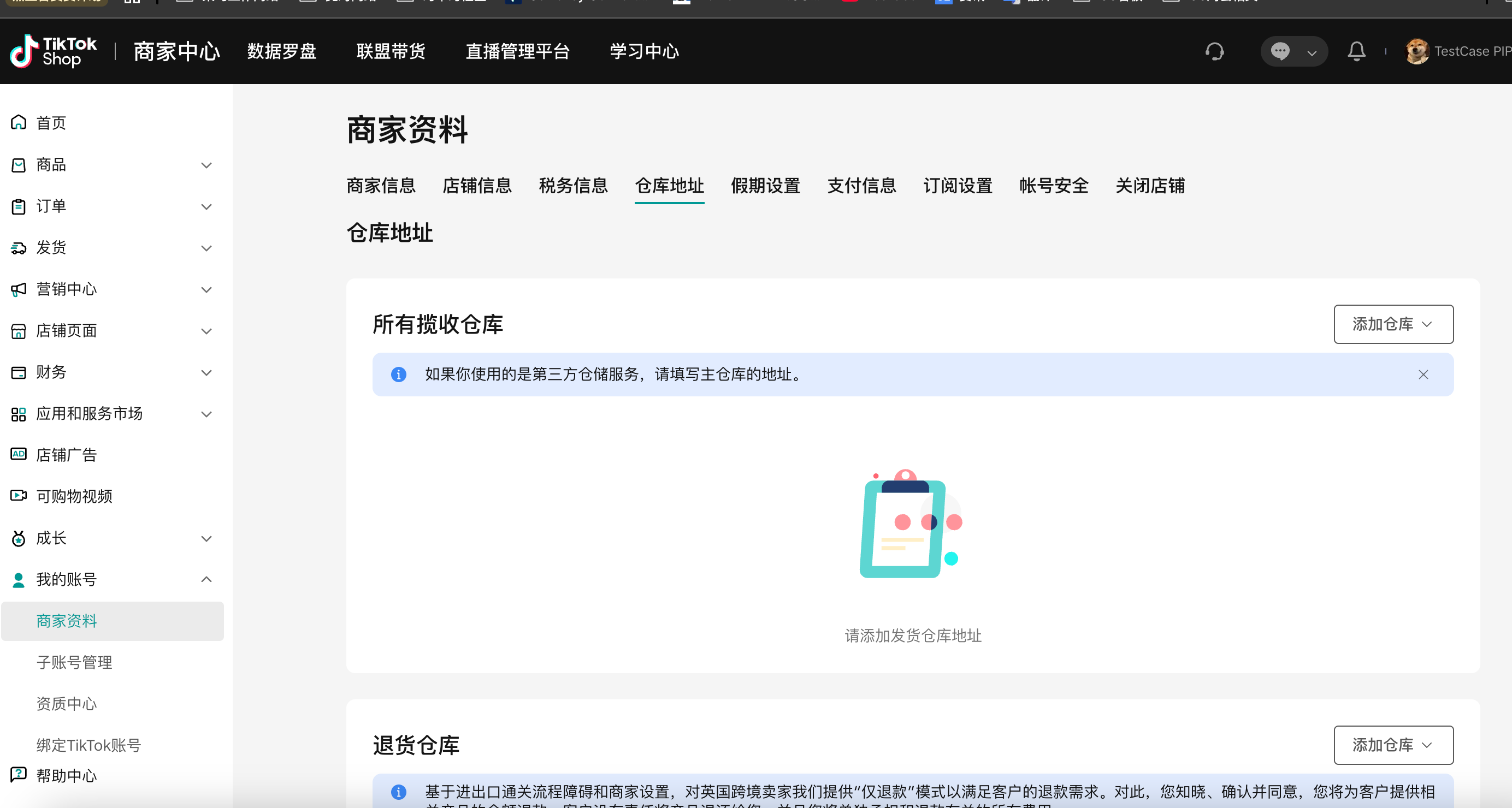 左侧导航栏 -> 我的账号 -> 商家资料 -> 仓库地址 -> 添加揽收仓库 -> 添加退货仓库