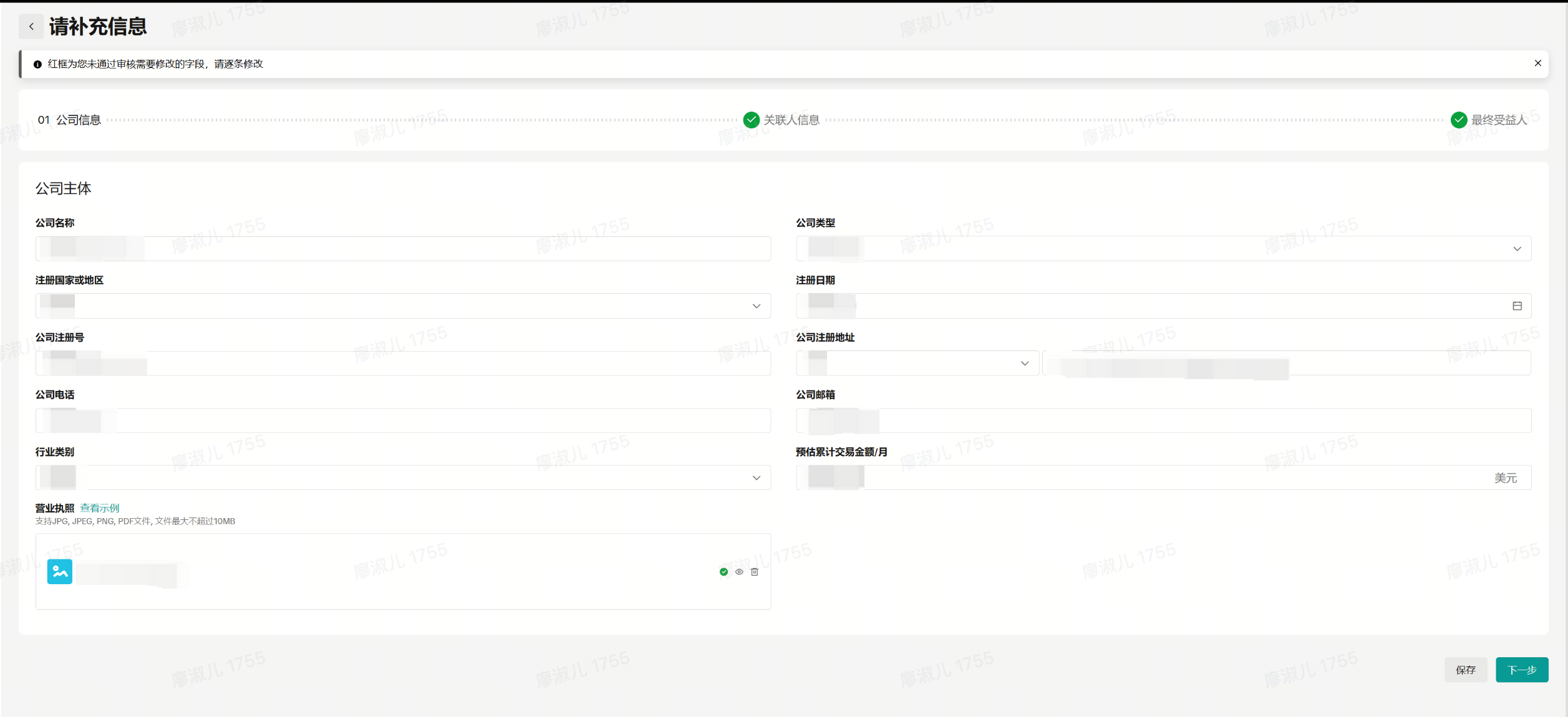 - 填写的最终受益人不全:最终受益人为完成公司股份25%及以上的自然人,可能存在多个符合要求的自然人,则均需要在系统进行受益人信息提交;可借助企查查进行查询