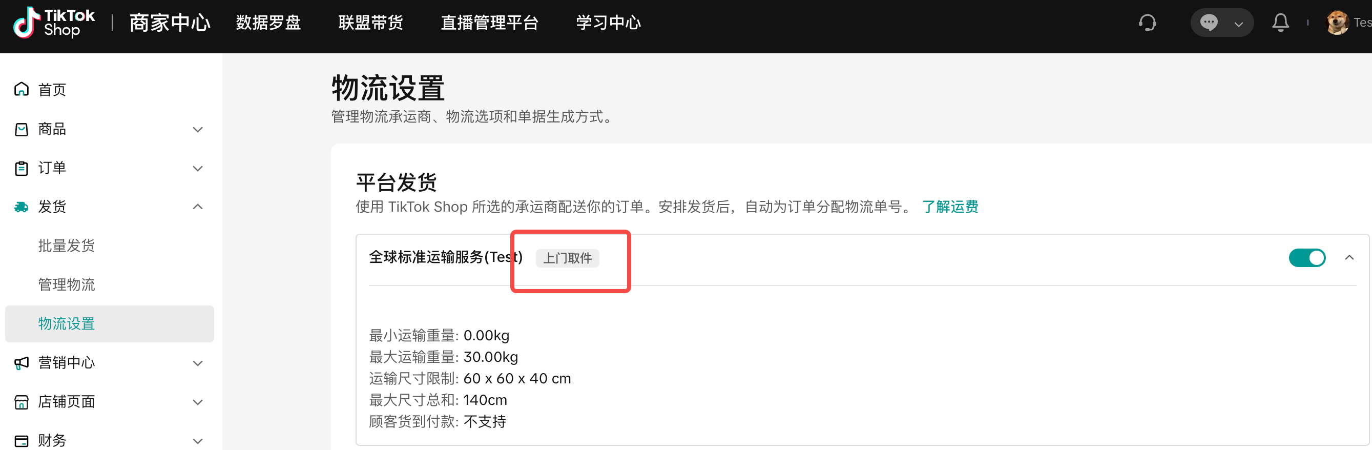 - 设置仓库后即可在 左侧工具栏 -> 发货 -> 物流设置 看到平台发货选项,直邮无需设置运费模版,上门取件表示该仓库在平台揽收范围内,若平台不揽收需要商家自送