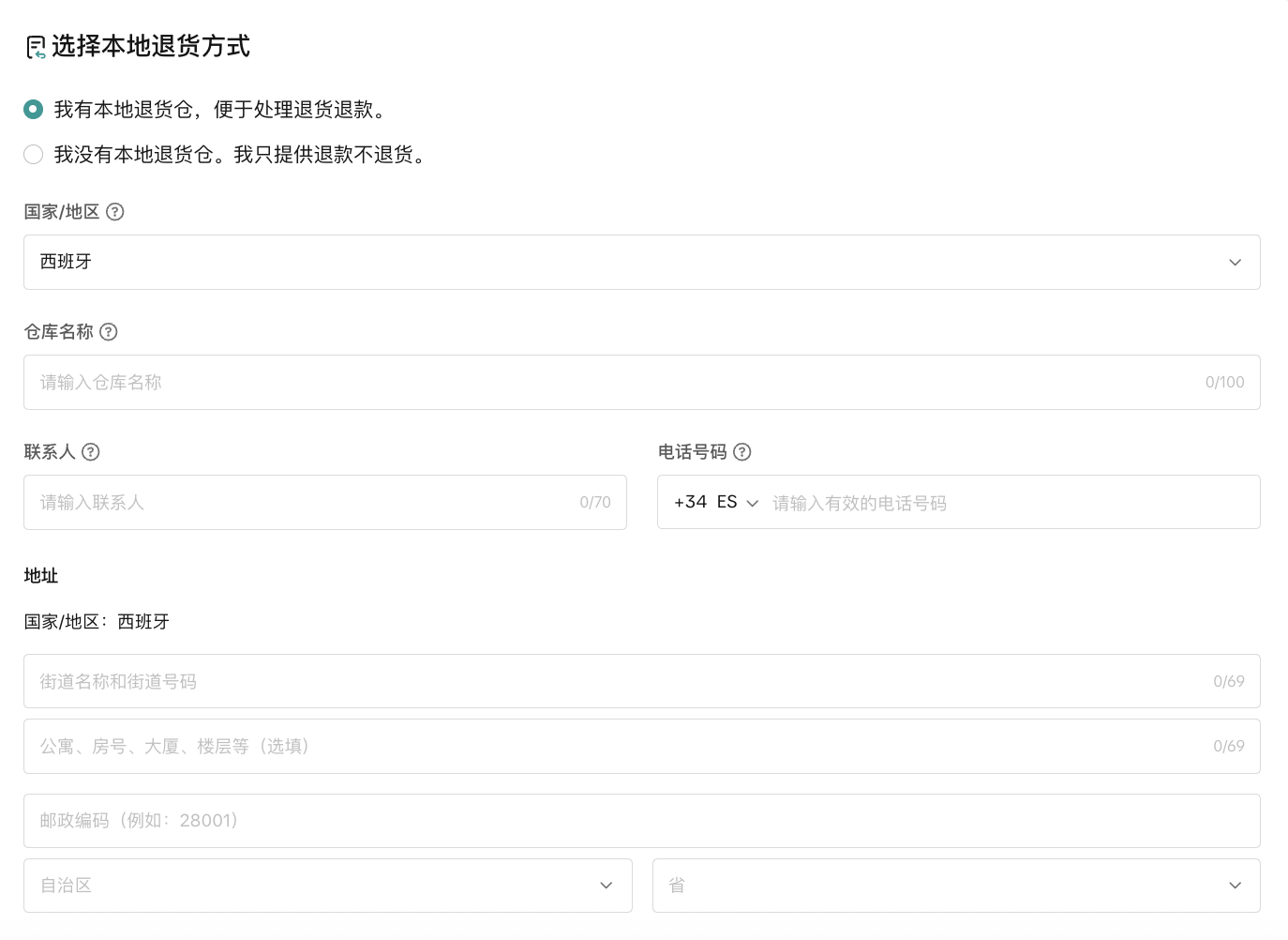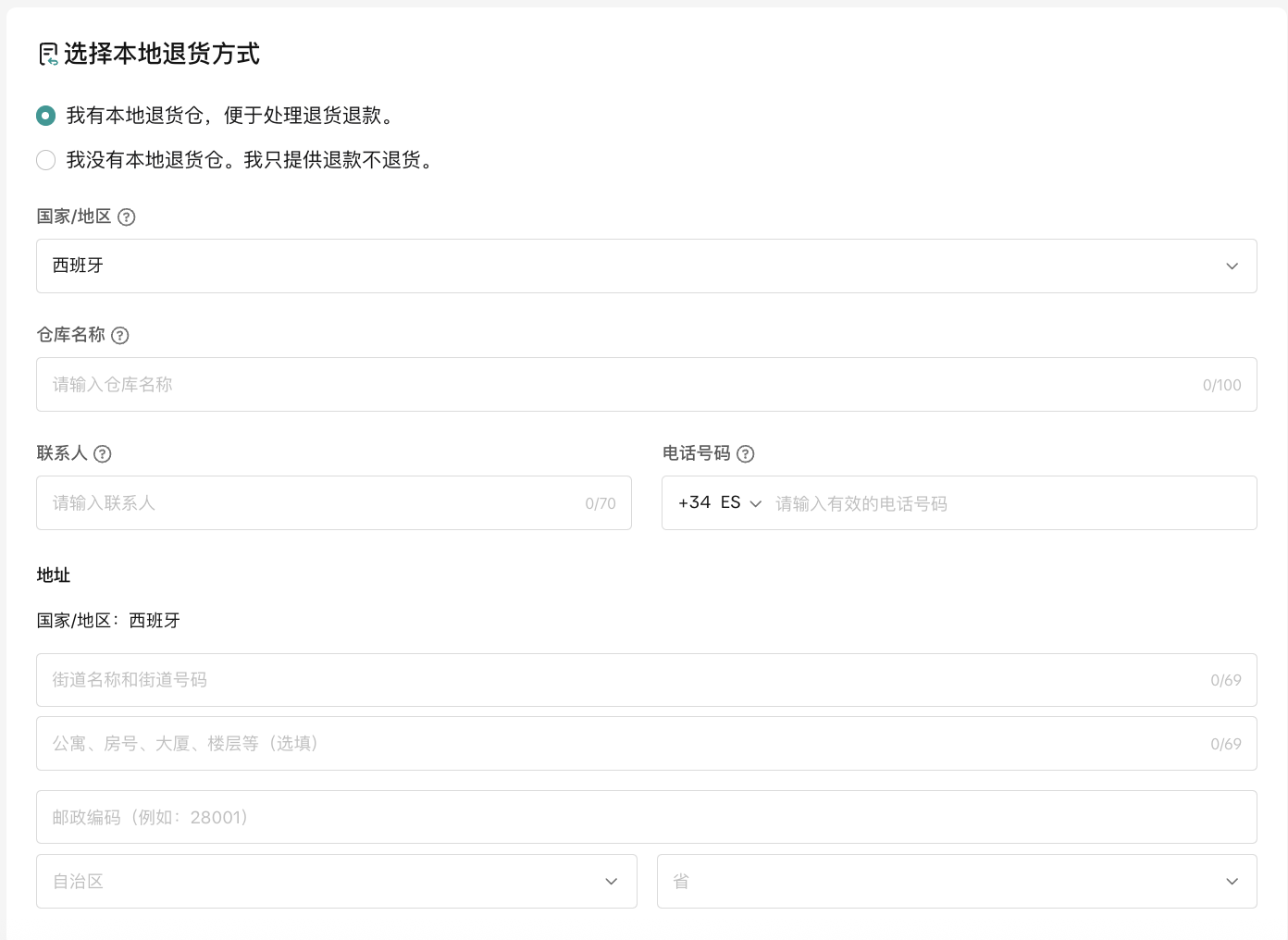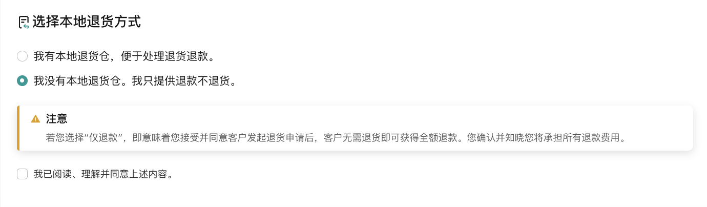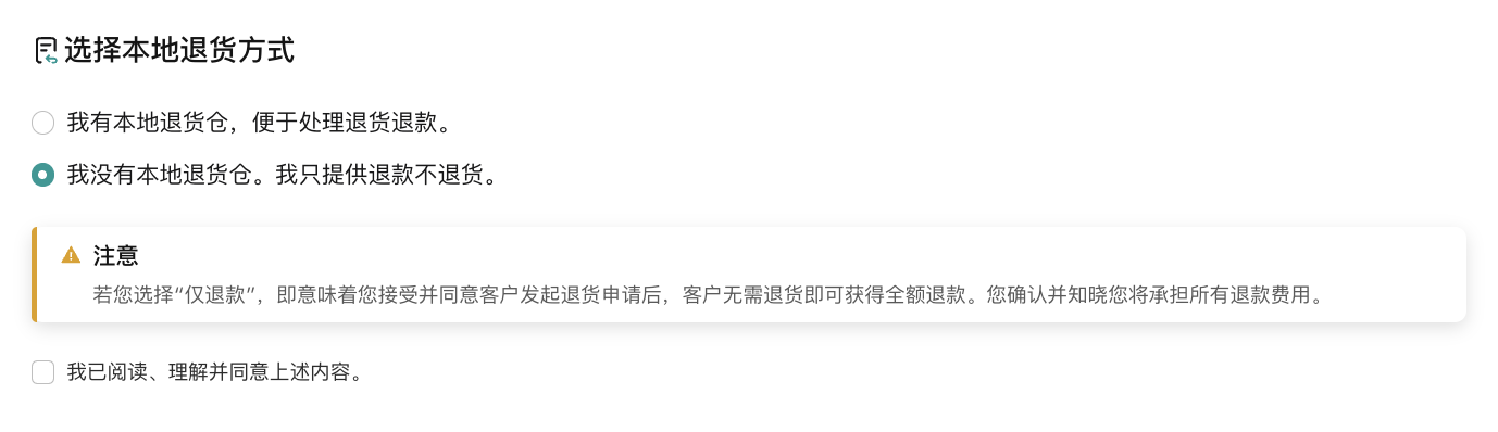 选择本地退货方式,设置退货仓地址,提升二次销售机会;以日本为例添加本地仓库地址或选择不退货仅退款。