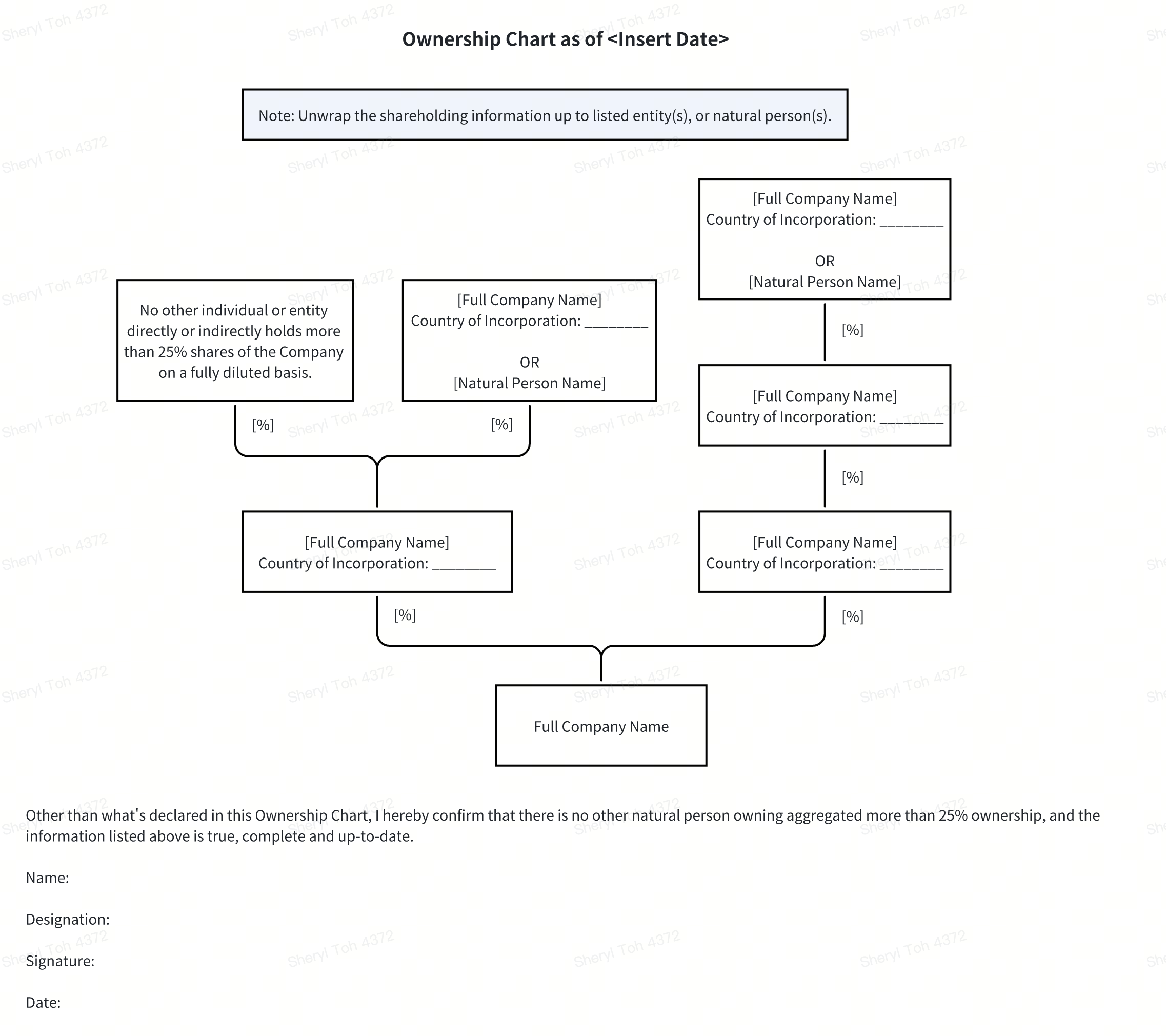 | 股东架构图(首次填写不需要提供,若被驳回可能会要求提供) | – 辅助板块;系统无显示此板块则不需填写,如果系统新增了则需填写; – 如果此公司 没有拥有25%及以上的股权人员 或 没有最终受益人信息,则需补充股东架构图来判断最终受益人。 可以直接从企查查截图提供: ![]() ![]() – 股东架构图需要董事/股东的签字 – 支持JPG,JPEG,PNG,PDF文件,文件最大不超过10MB | – 如果此公司 没有拥有25%及以上的股权人员 或 没有最终受益人信息,则需补充股东架构图来判断最终受益人。例如 某香港商家的大部分股权持有者是另一家公司; 架构图举例,中国香港商家若提供股东架构图,需要董事签字确认。 ![]() ![]() | |