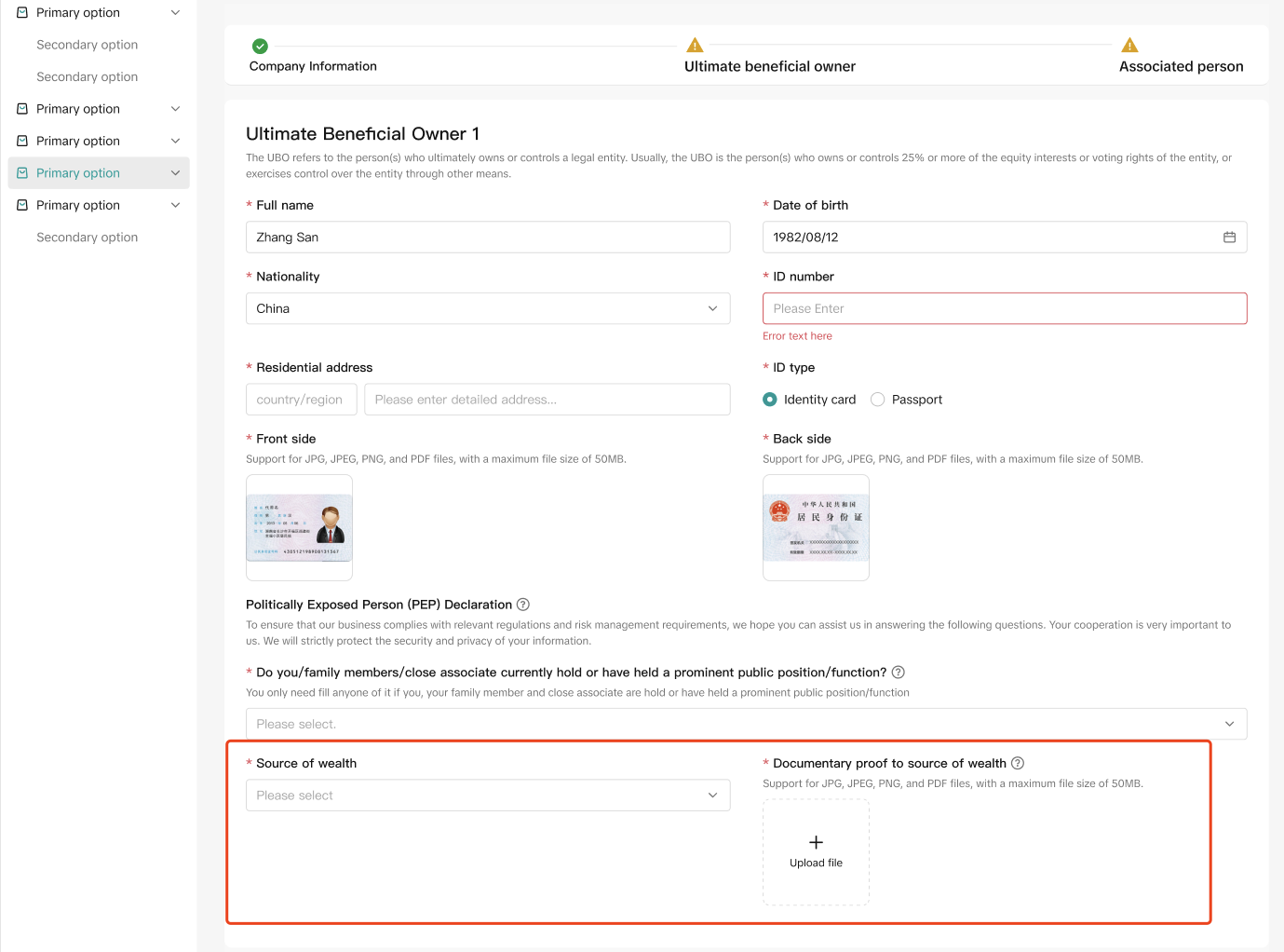 | 附件-身份证照片/护照照片 | – 如果是身份证,正面、反面需上传对应位置;如果是护照,需包含签名页; – 建议上传拍照原图、证件显示清晰及完整,图片不存在修图、无水印、非复印件、可读取/打开; – 支持JPG,JPEG,PNG,PDF文件,文件最大不超过10MB | 若最终受益人户籍为中国香港,则需要提供护照+地址证明,不可选择身份证。 – 如果「证件类型」选择护照,则需补充地址证明; – 需要补充近3个月的水电费账单/电话费账单/信用卡账单 来确认此人员目前居住的地方,账单上需显示此人员的姓名、地址。 – 支持JPG,JPEG,PNG,PDF文件,文件最大不超过10MB | |