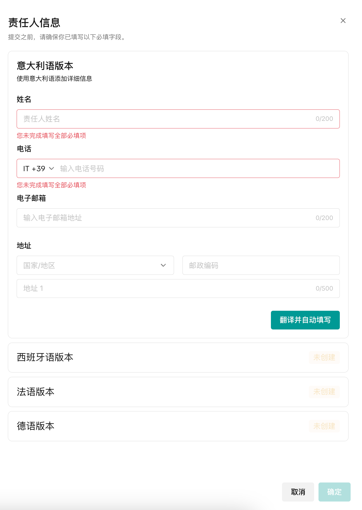 点击责任人信息,录入欧盟店铺对应国家的责任人。请使用对应国家的语言填写责任人信息。