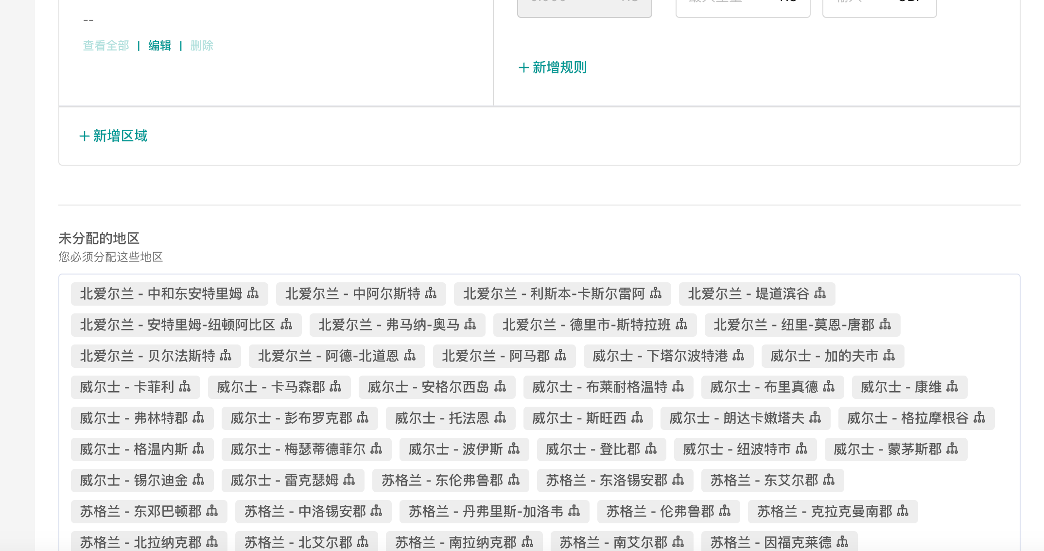 选择发货仓 -> 配置不配送地区 -> 配置配送地区 -> 设置运输规则(即价卡),未分配的地区系统会做提示