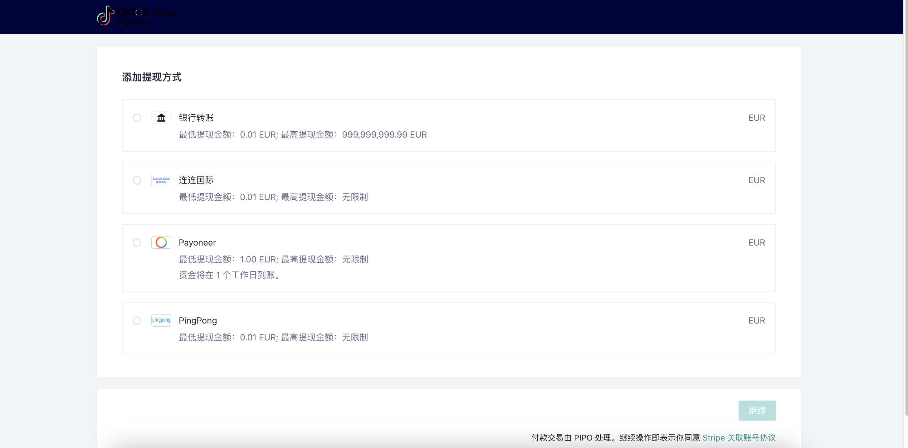 2.如您注册TikTok Shop时使用的公司资质是中国大陆营业执照但是法人证件非中国大陆地区的居民身份证(护照或者香港居民身份证),请使用企业网银或派安盈(Payoneer)进行支付,使用个人支付宝或个人网银将会支付失败,需要对公账户支付。