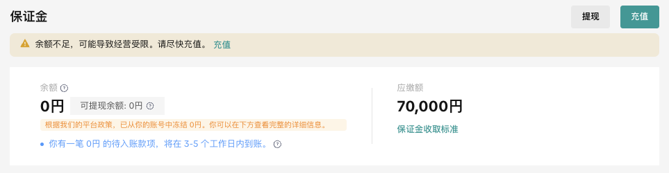 不同市场缴纳的保证金金额是不同的,请以系统展示为准。从店铺首页或资产页面进入保证金,点击右上角充值。