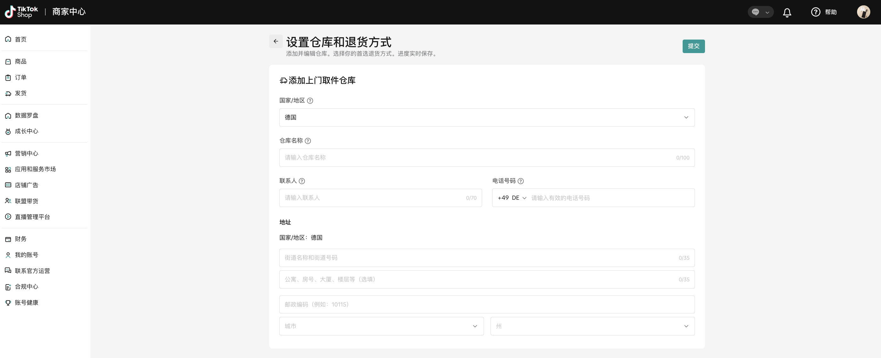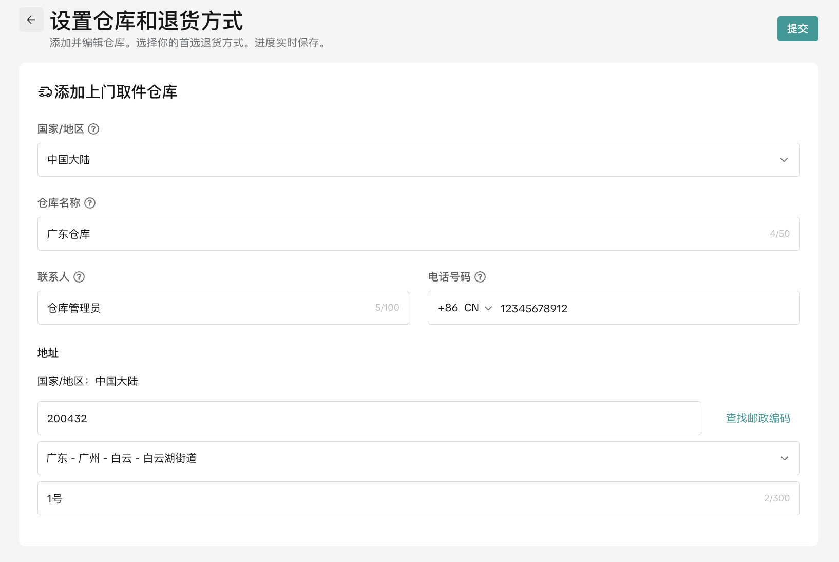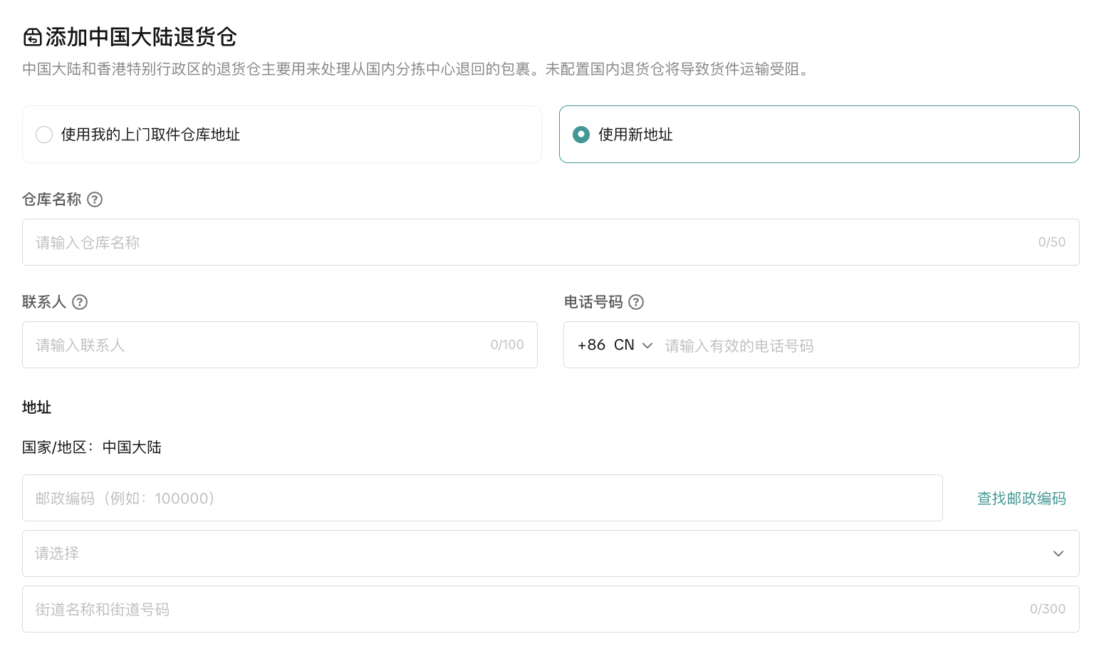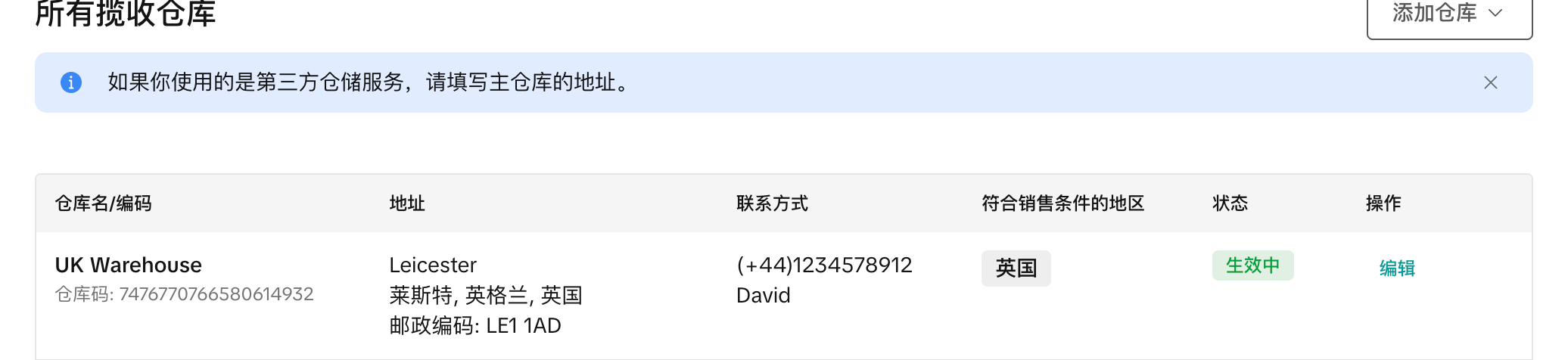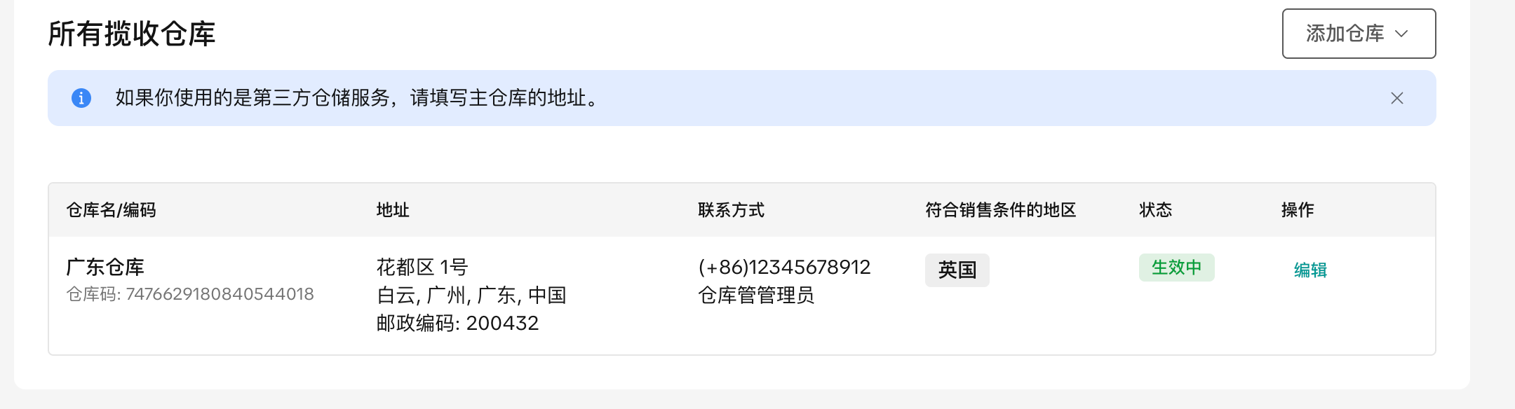 设置退货仓地址,如果你不从海外仓发货,请确保在中国大陆或香港特别行政区添加一个退货仓库,用于处理配送问题。需要完成此操作才能打印物流面单。若有英国仓也可以设置英国仓地址。