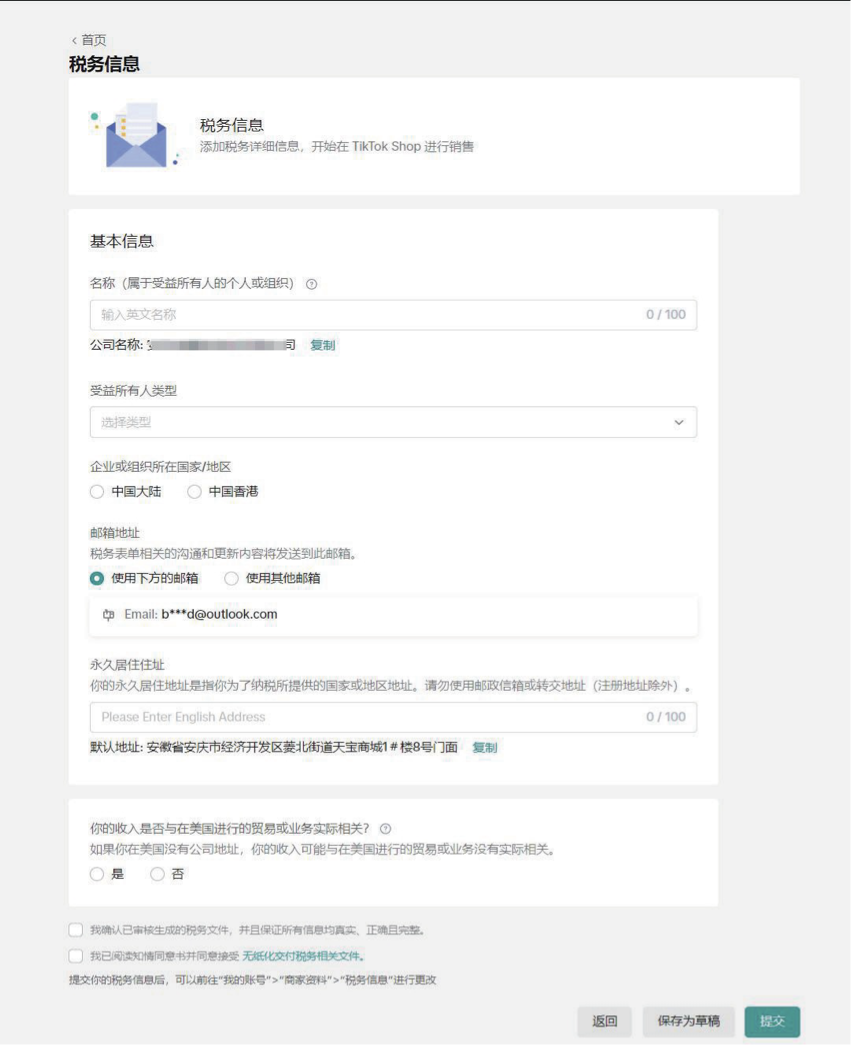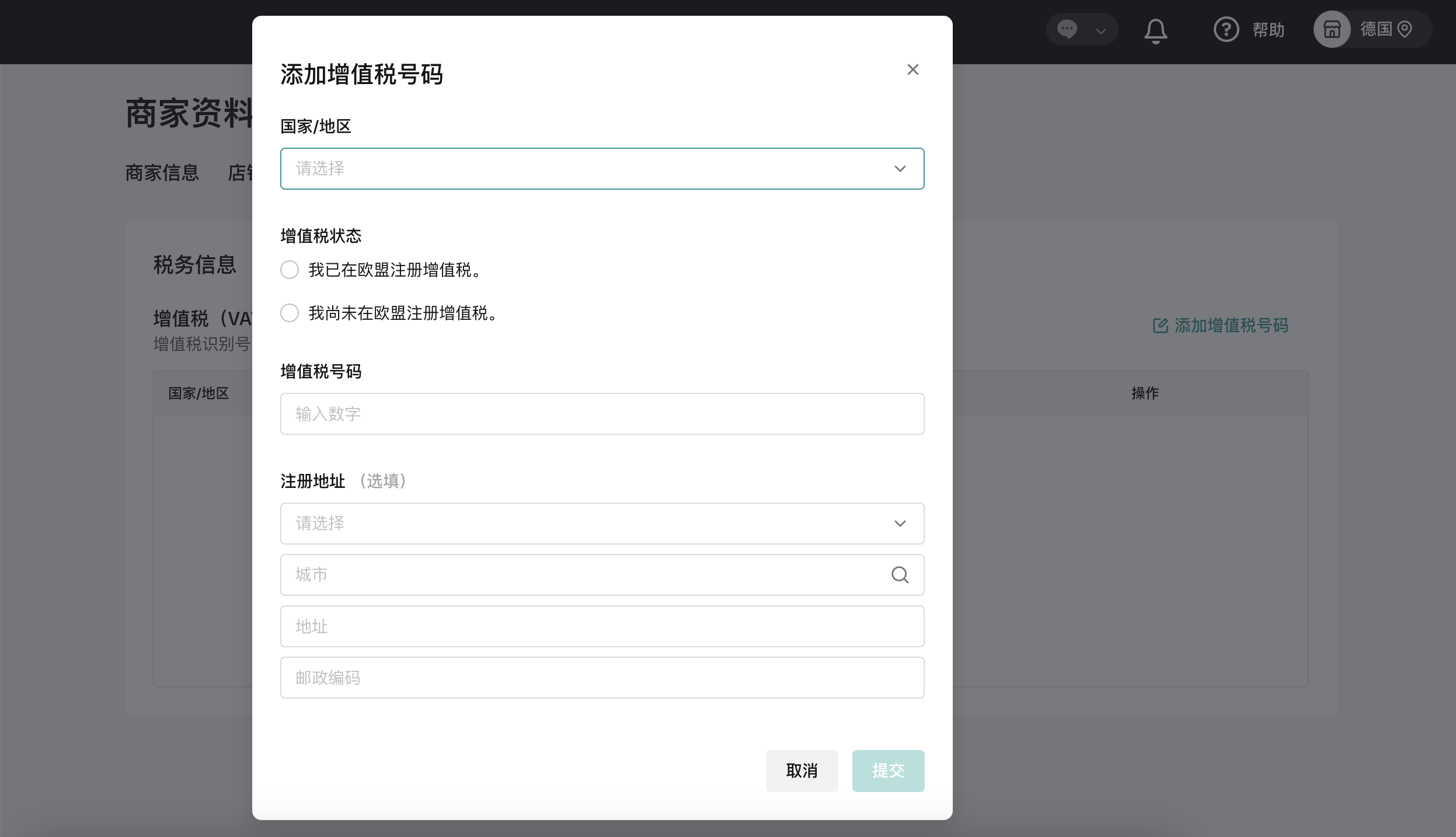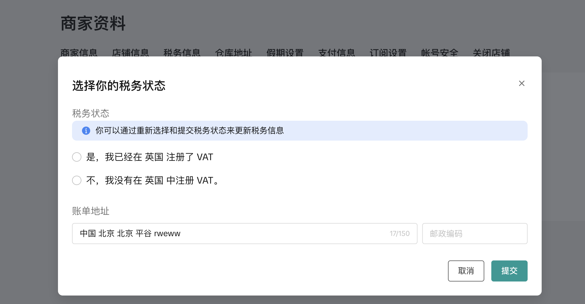 点击「去填写」跳转至我的账号-商家资料-税务信息模块,该模块可支持商家录入店铺增值税信息。也可支持对已录入信息进行编辑修改。