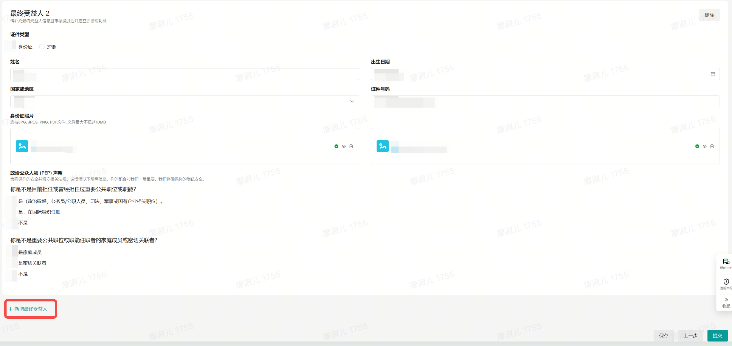| 新增最终受益人 | 存在多个受益人的情况下,需点击此按钮新增填写 | | |