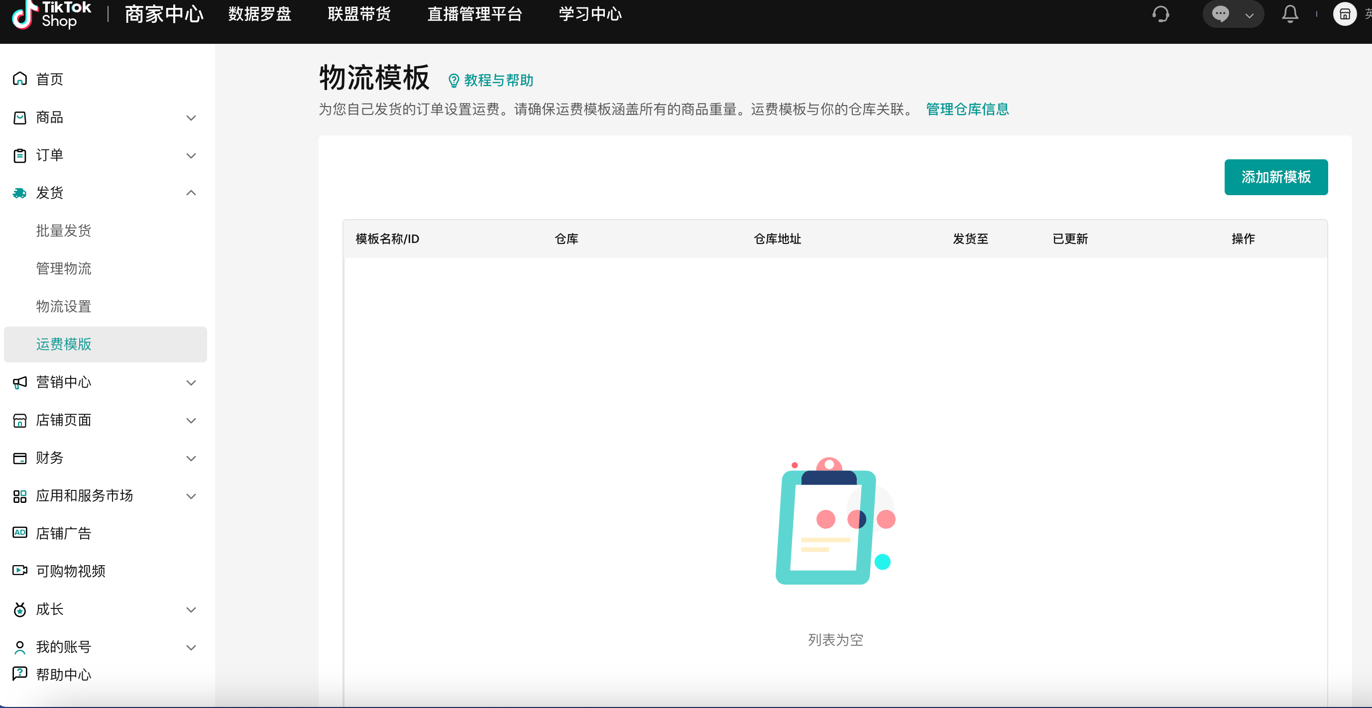 - 设置好仓库后,可以看到左侧导航栏 -> 发货 -> 运费模版 中可以添加新模版