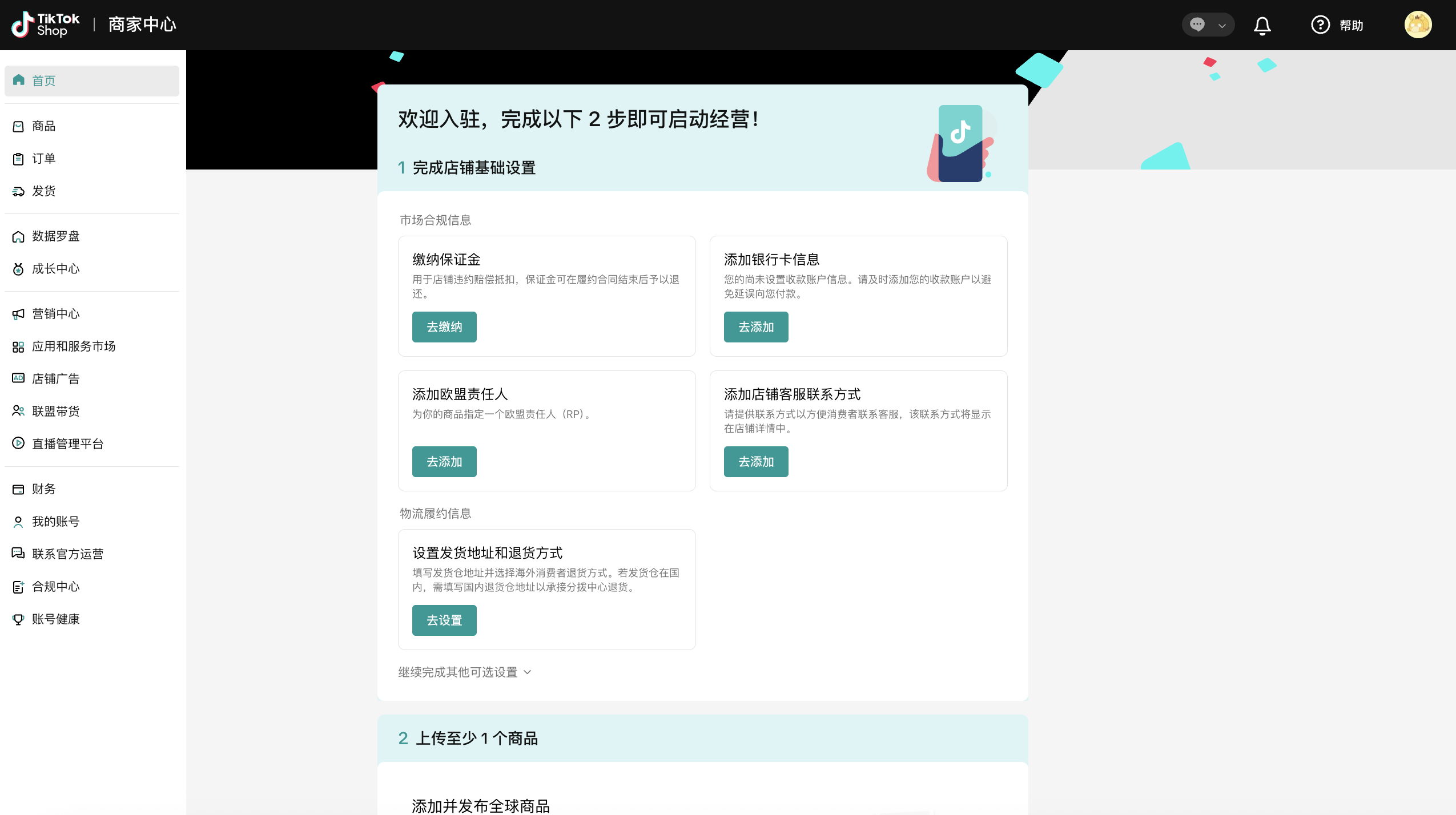 所有必做的店铺设置任务必须全部设置完成通过后才能发品开始经营。