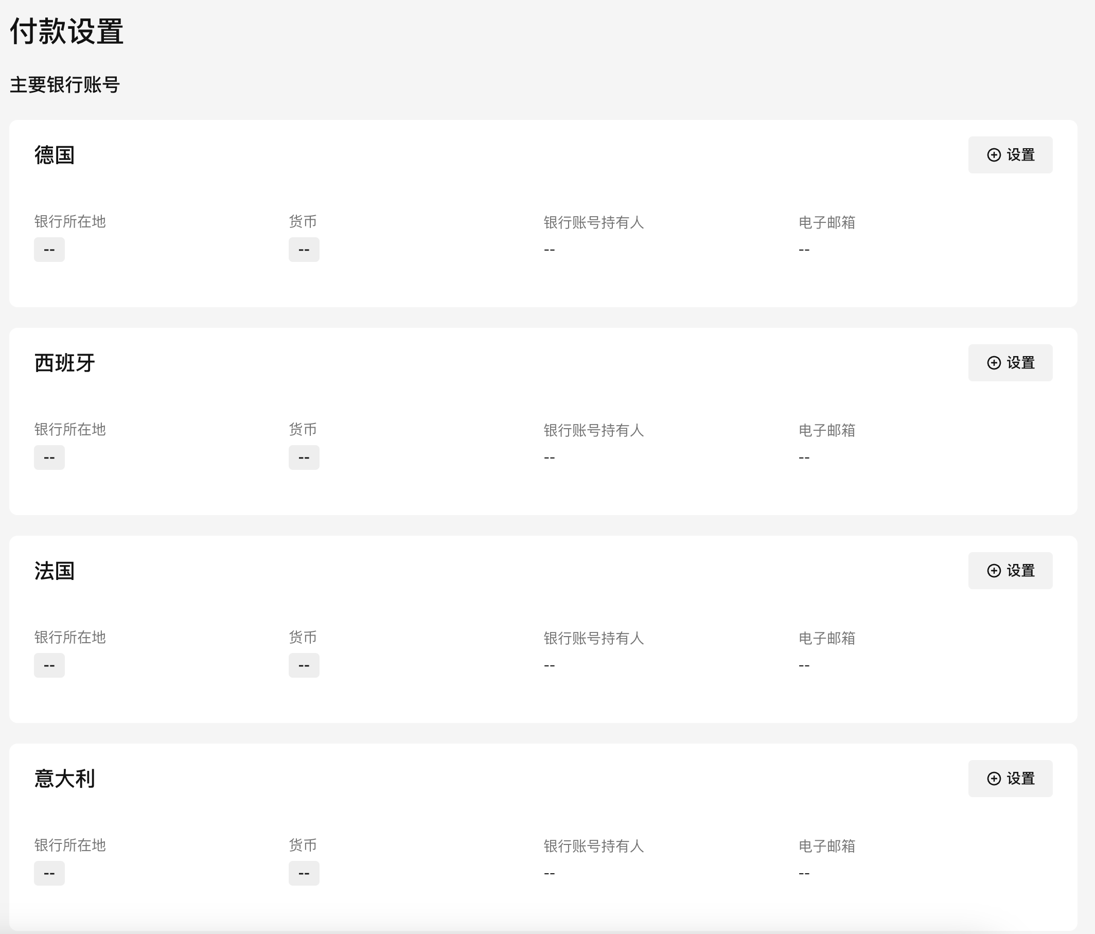 目前仅欧盟店铺需要绑定银行卡信息,用于首付款。不同国家店铺绑定不同的银行账号