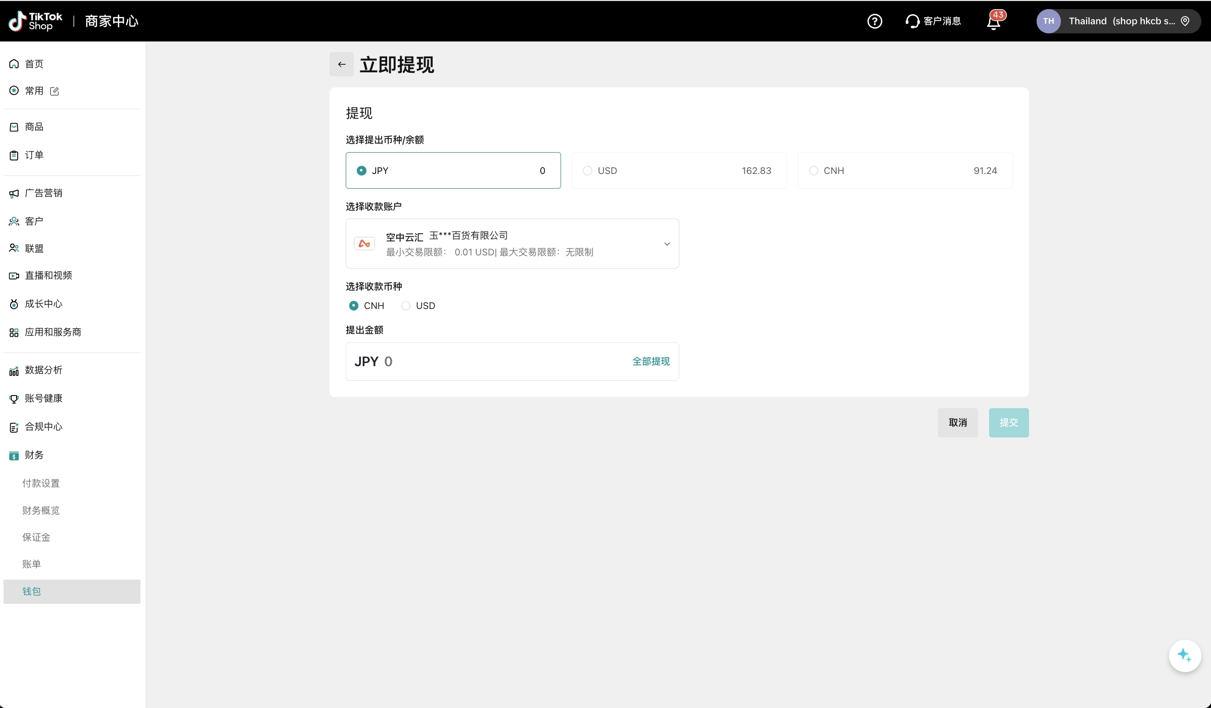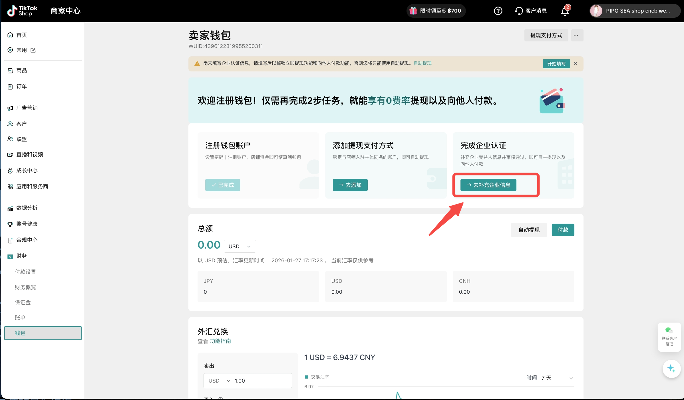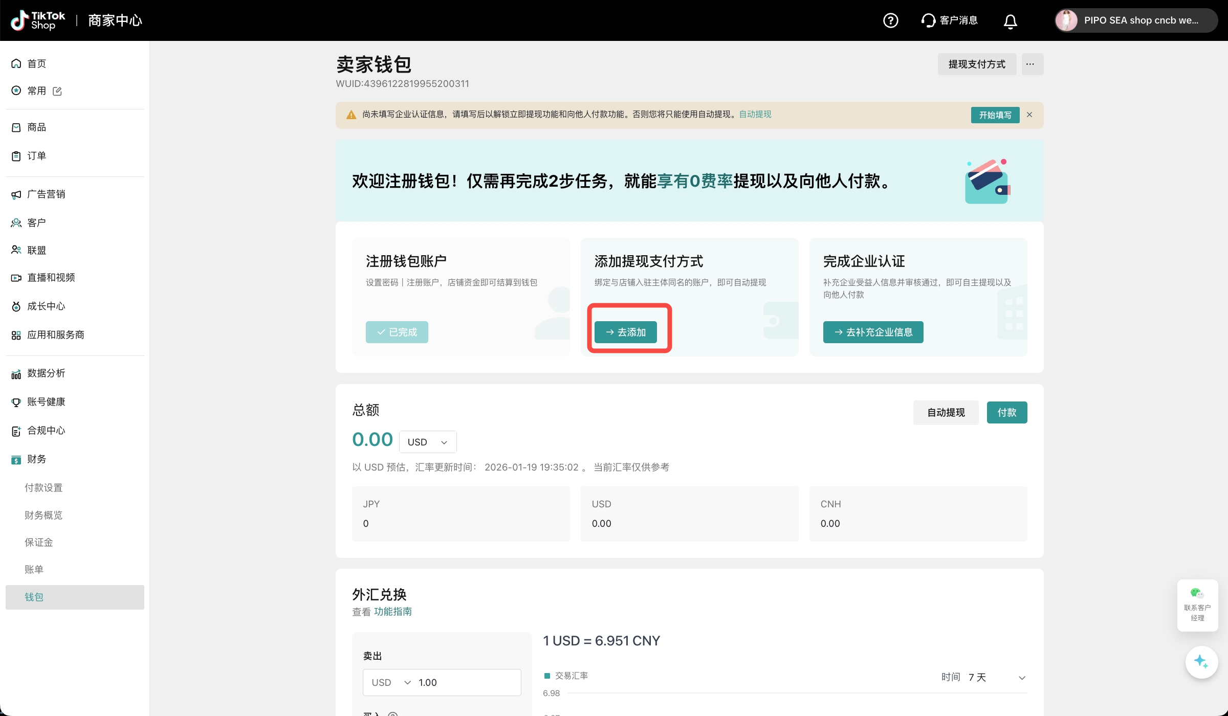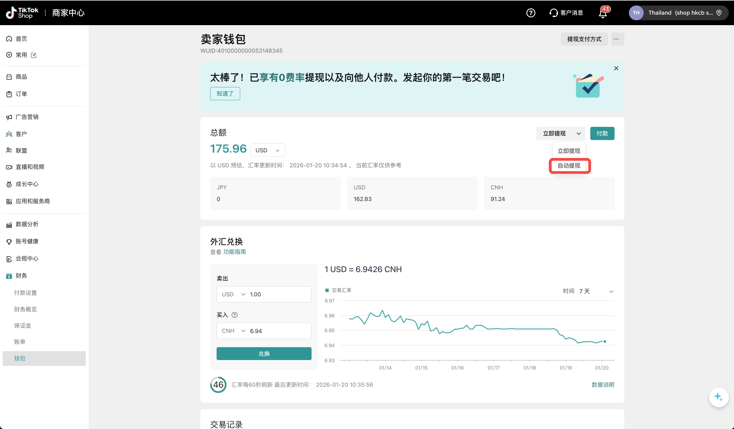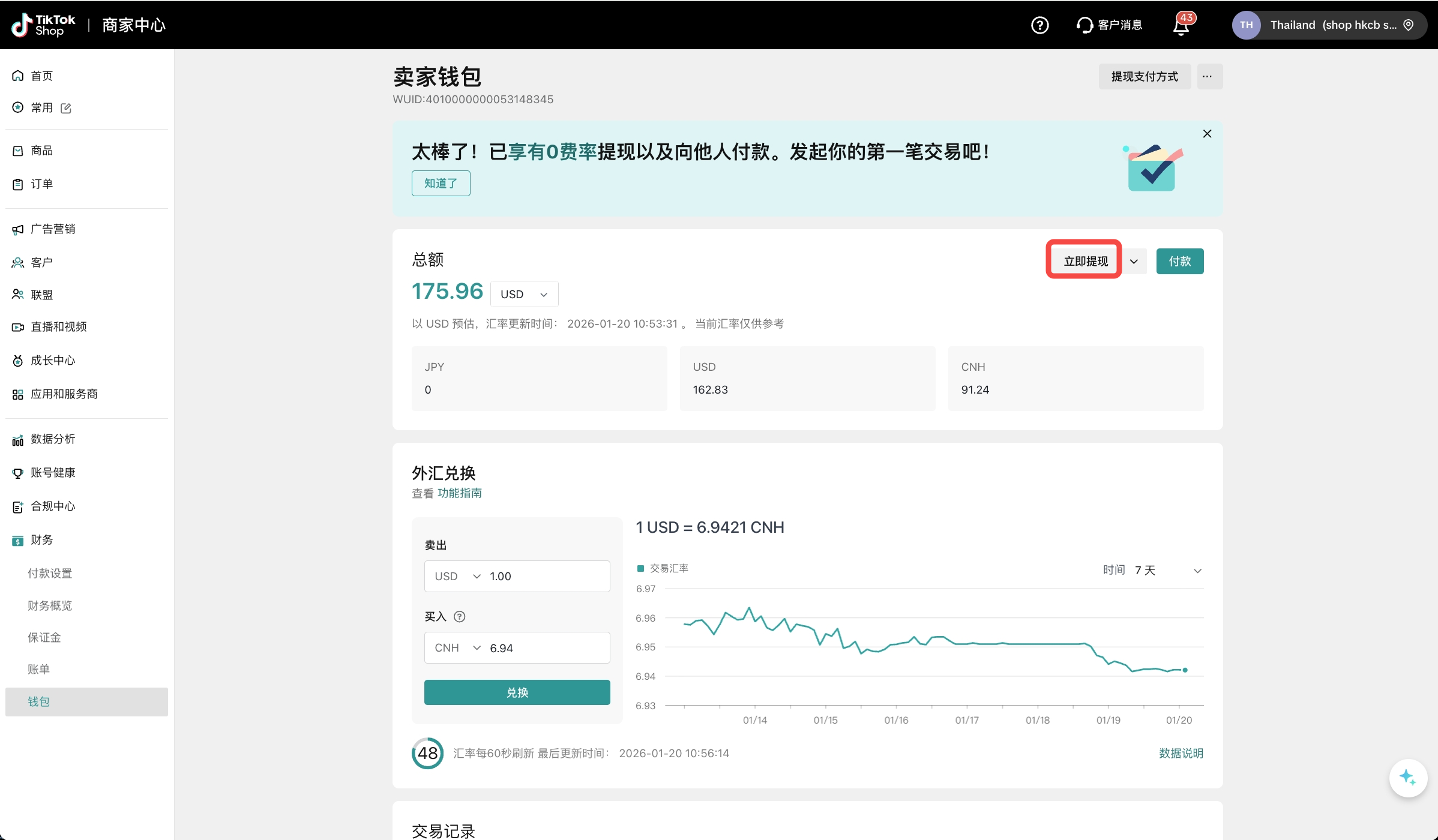 商家钱包是TikTok Shop为中国跨境卖家推出的一站式官方跨境收款服务,提供便捷优惠、安全合规的支付和兑换体验,您可以直接在商家中心完成钱包开通、一键绑店、提现/付款、实时换汇等全部操作。