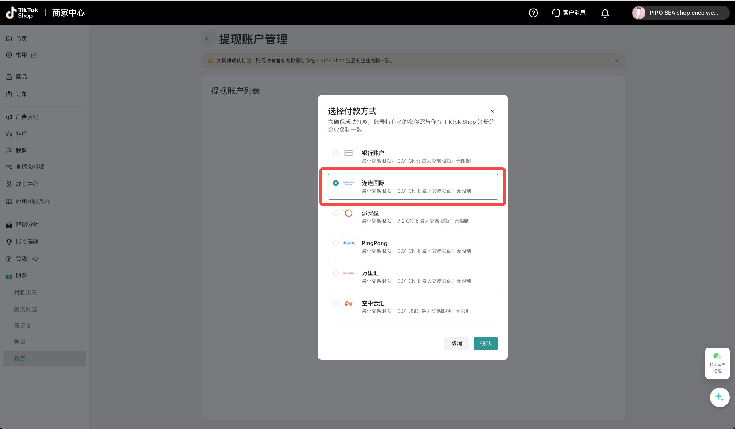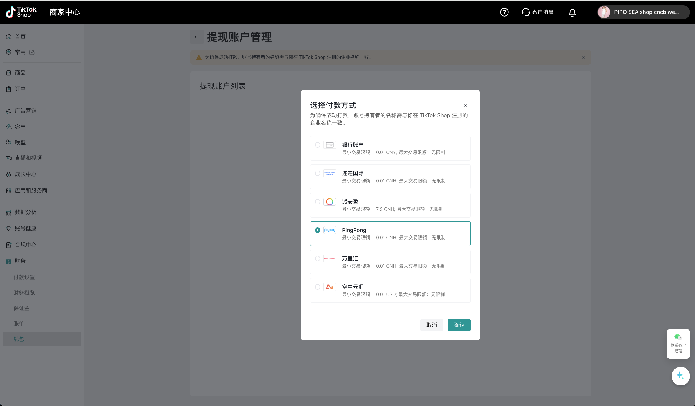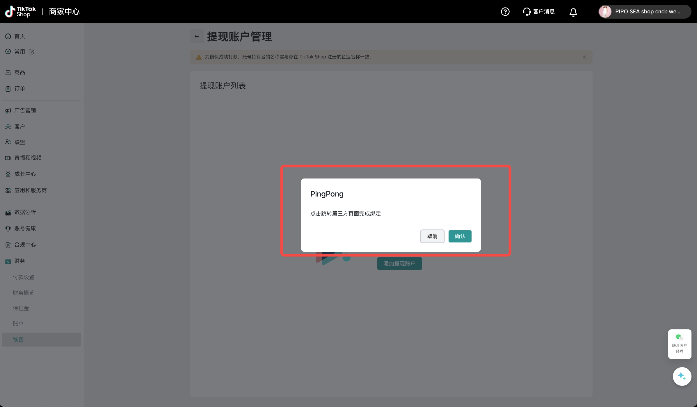 为确保成功打款,您需要选择与您在TikTok Shop注册的企业名称一致的PingPong账户进行绑定;若您无PingPong账号,您需要在PingPong注册填写相关信息,并完成实名认证