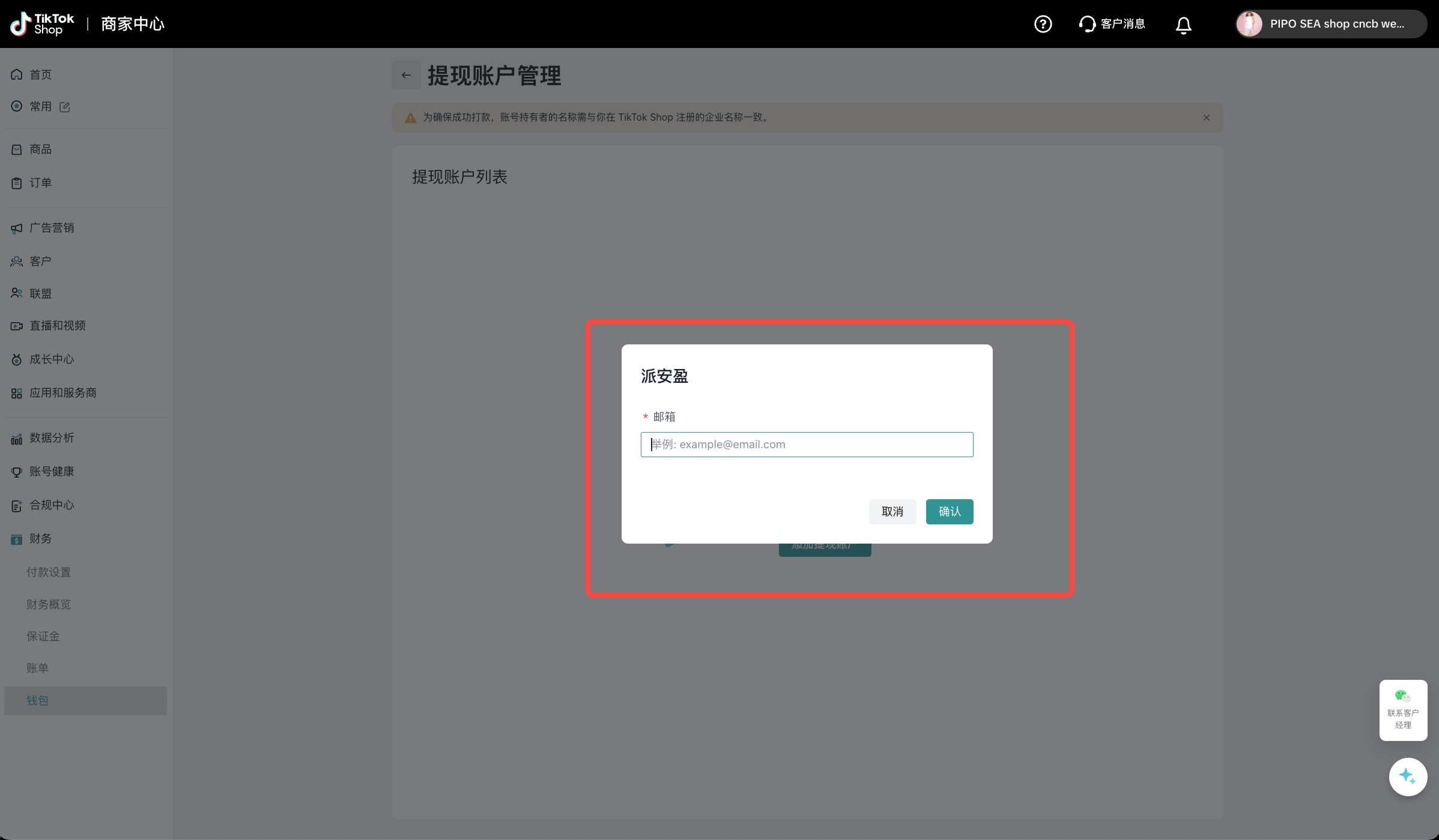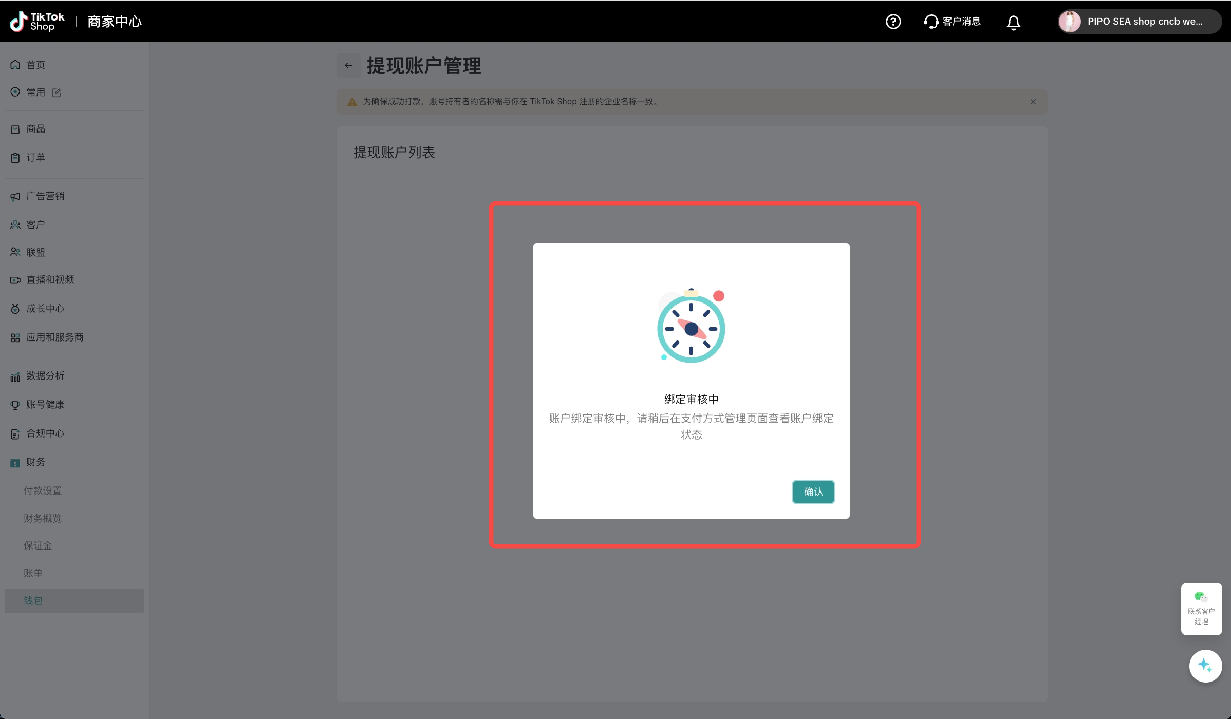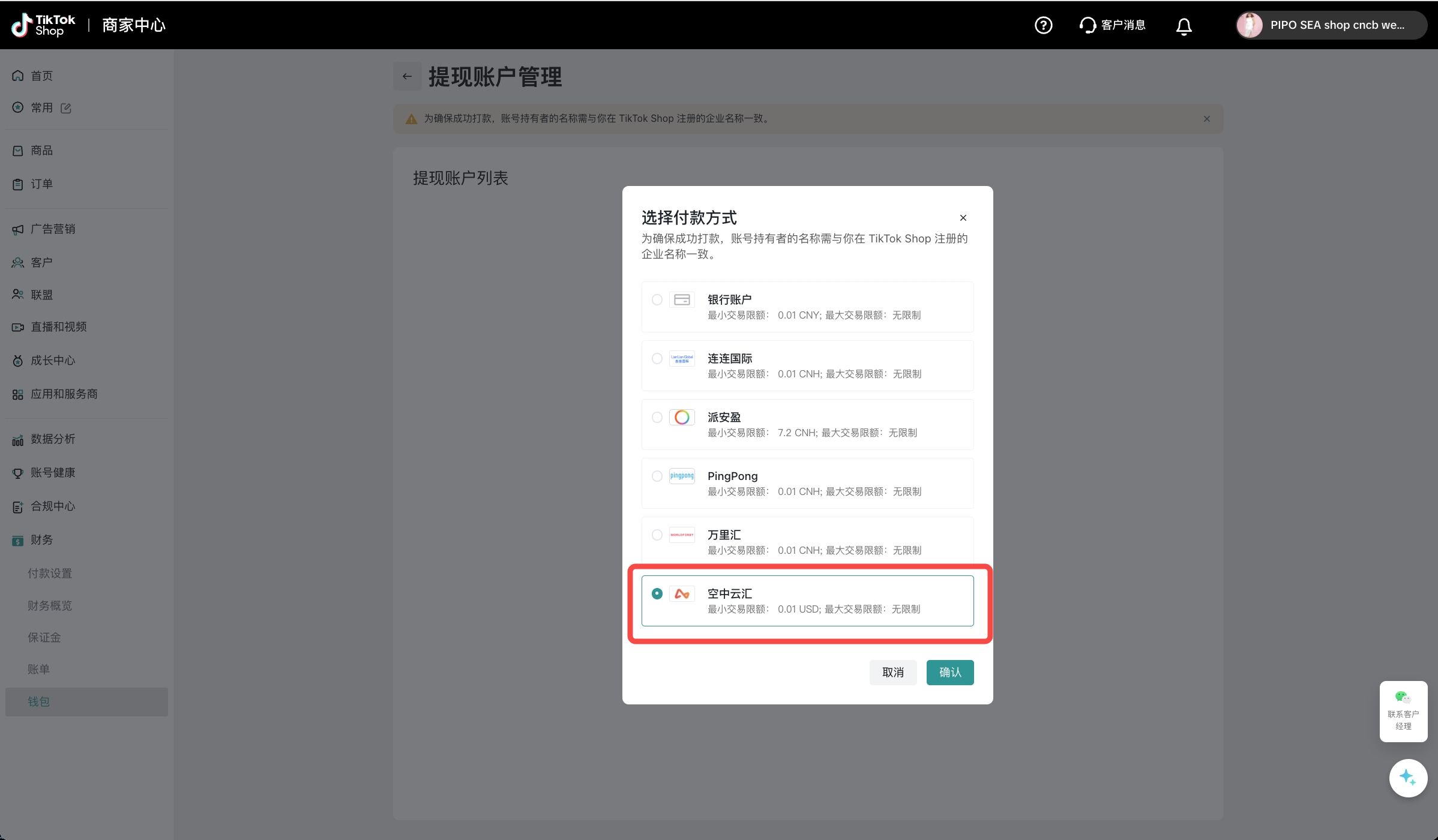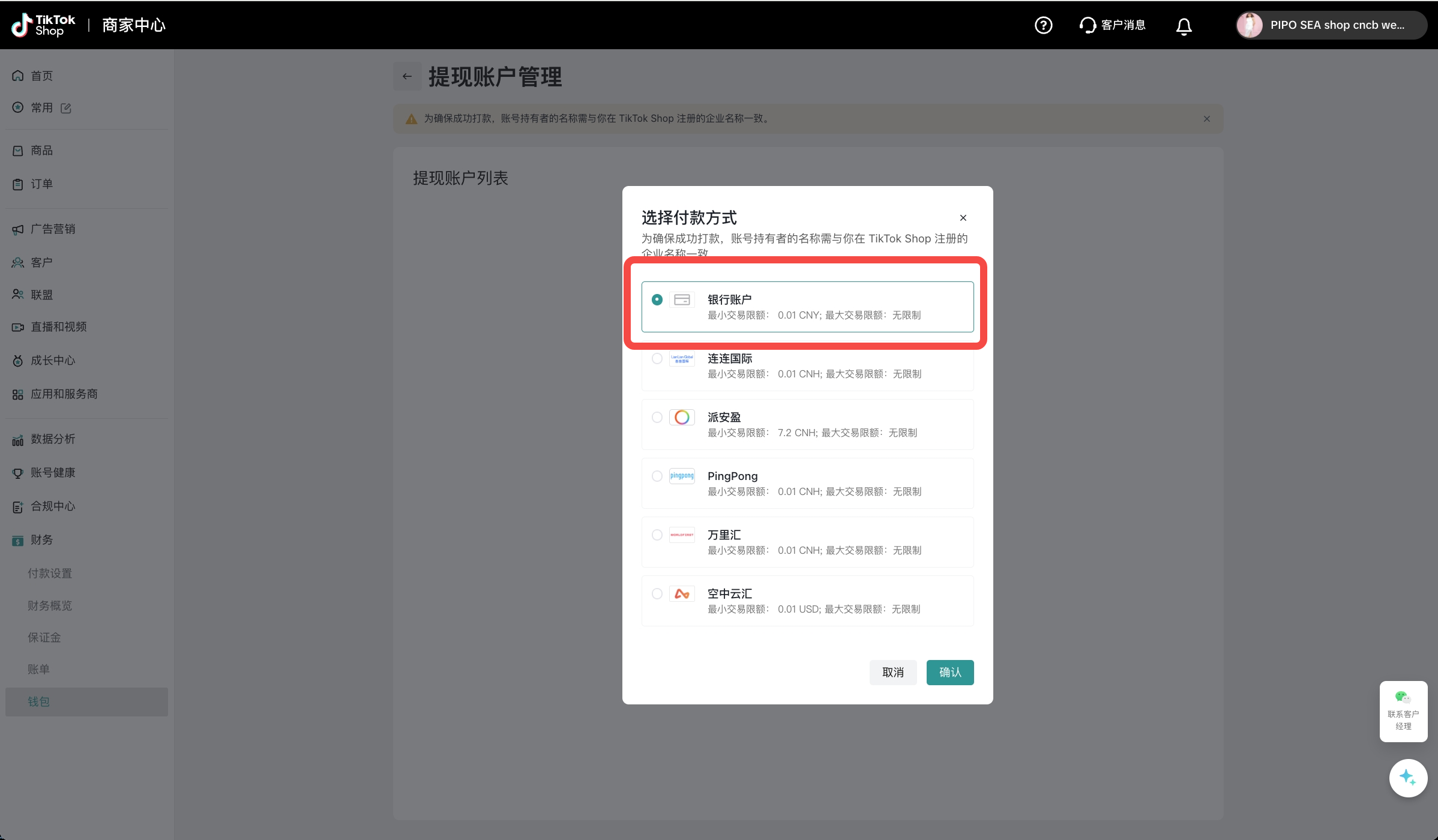 为确保成功打款,您需要选择与您在TikTok Shop注册的企业名称一致的PingPong账户进行绑定;若您无PingPong账号,您需要在PingPong注册填写相关信息,并完成实名认证