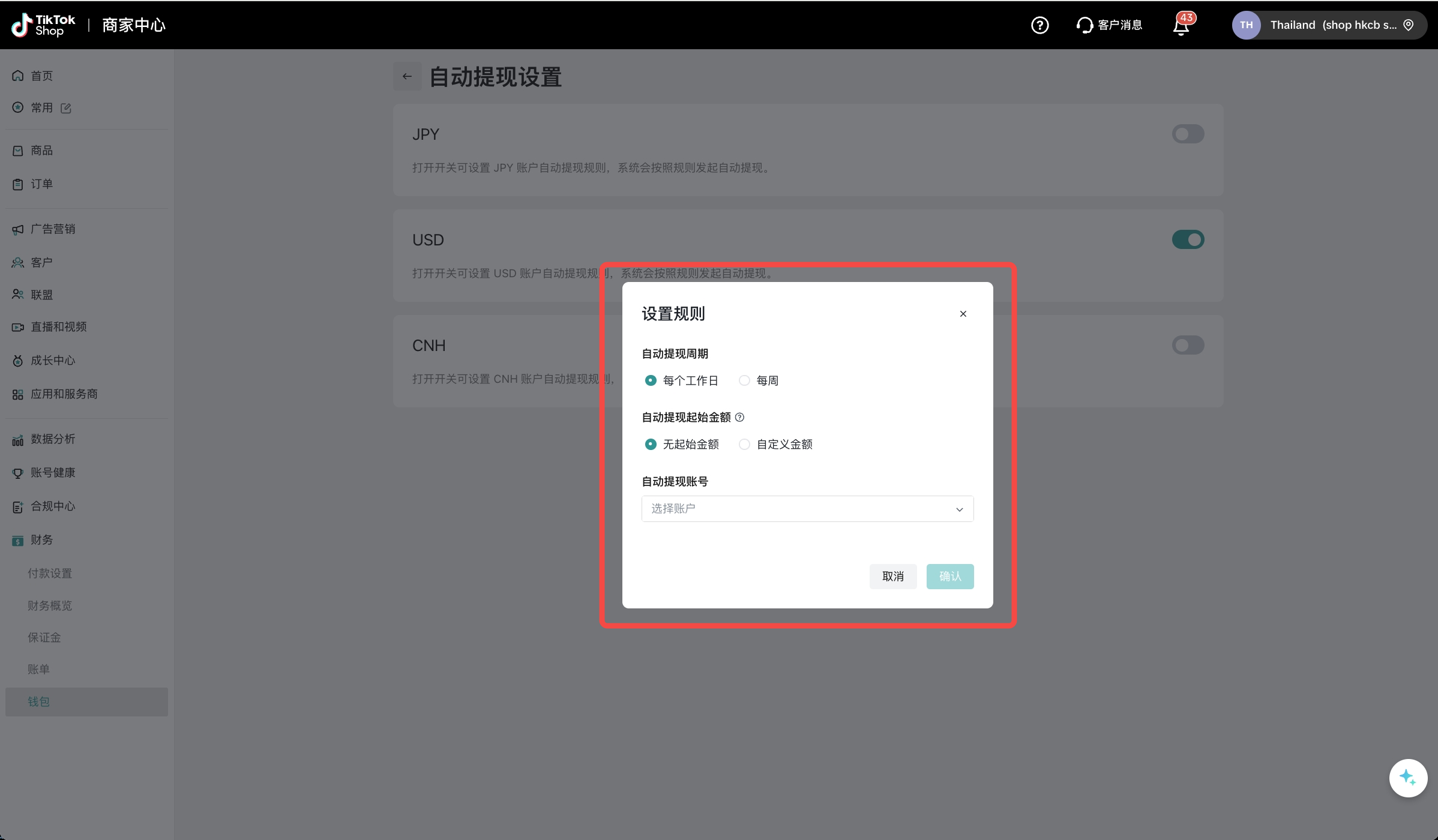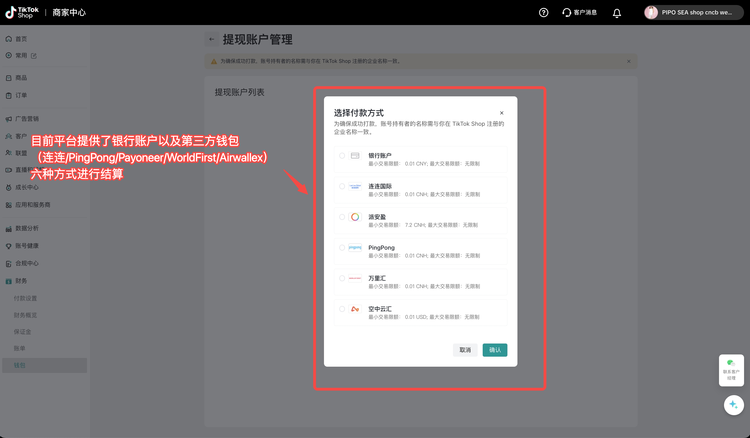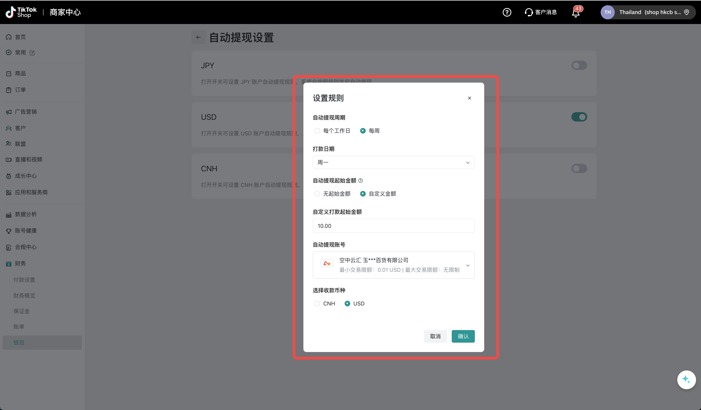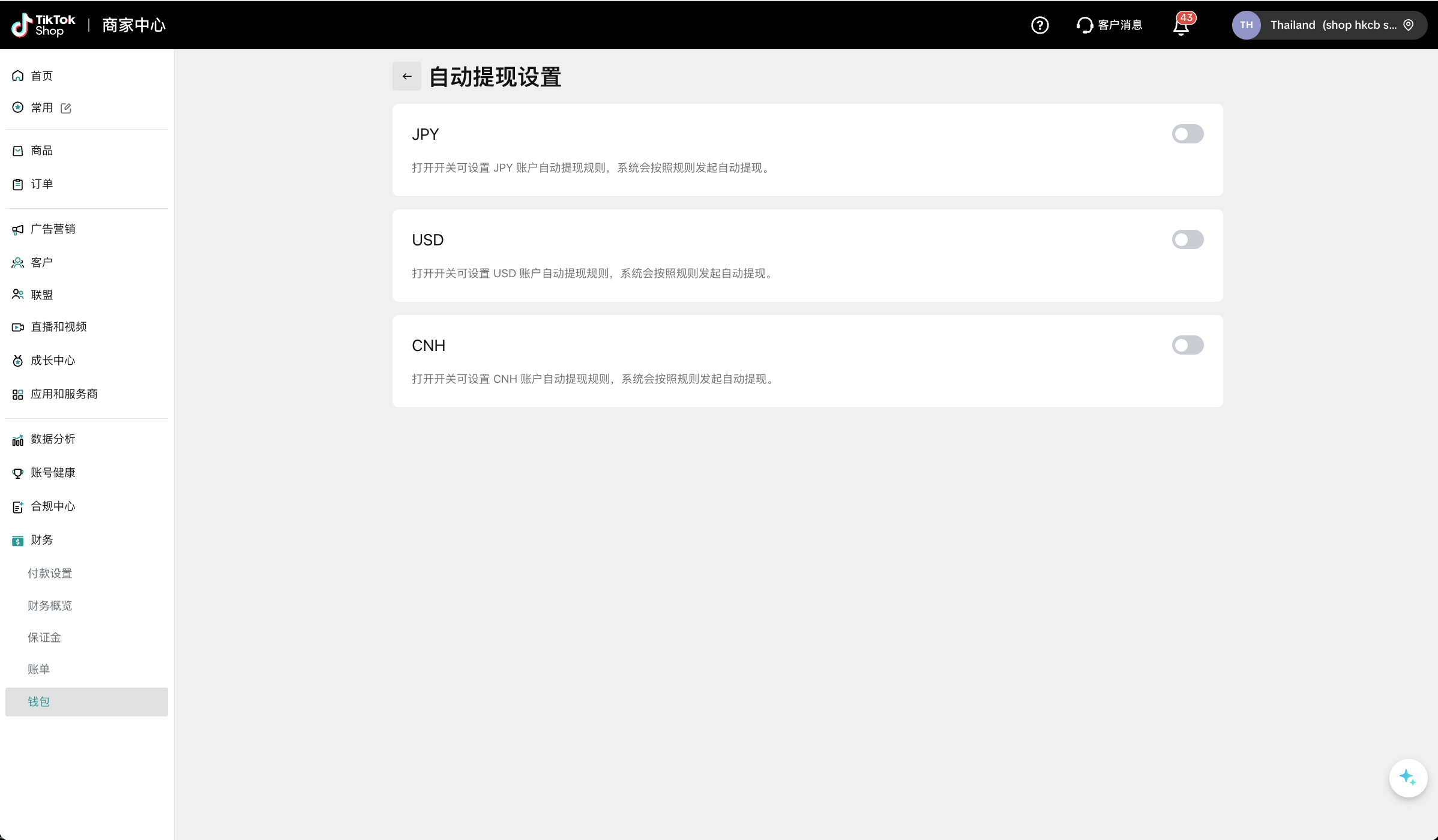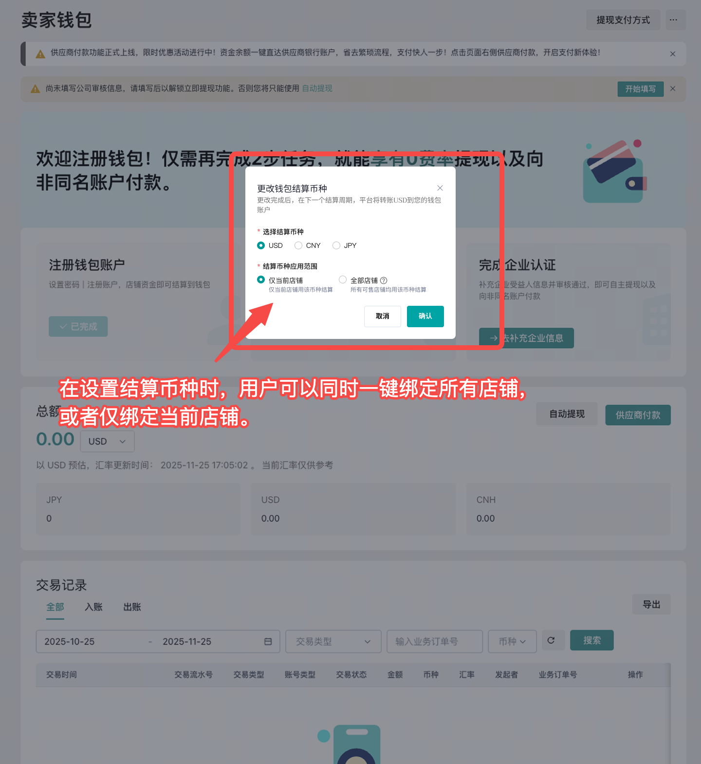 若结算币种应用范围选择“全部店铺”时,您所有经营中的店铺都会绑定钱包,且使用您选择的结算币种进行结算。