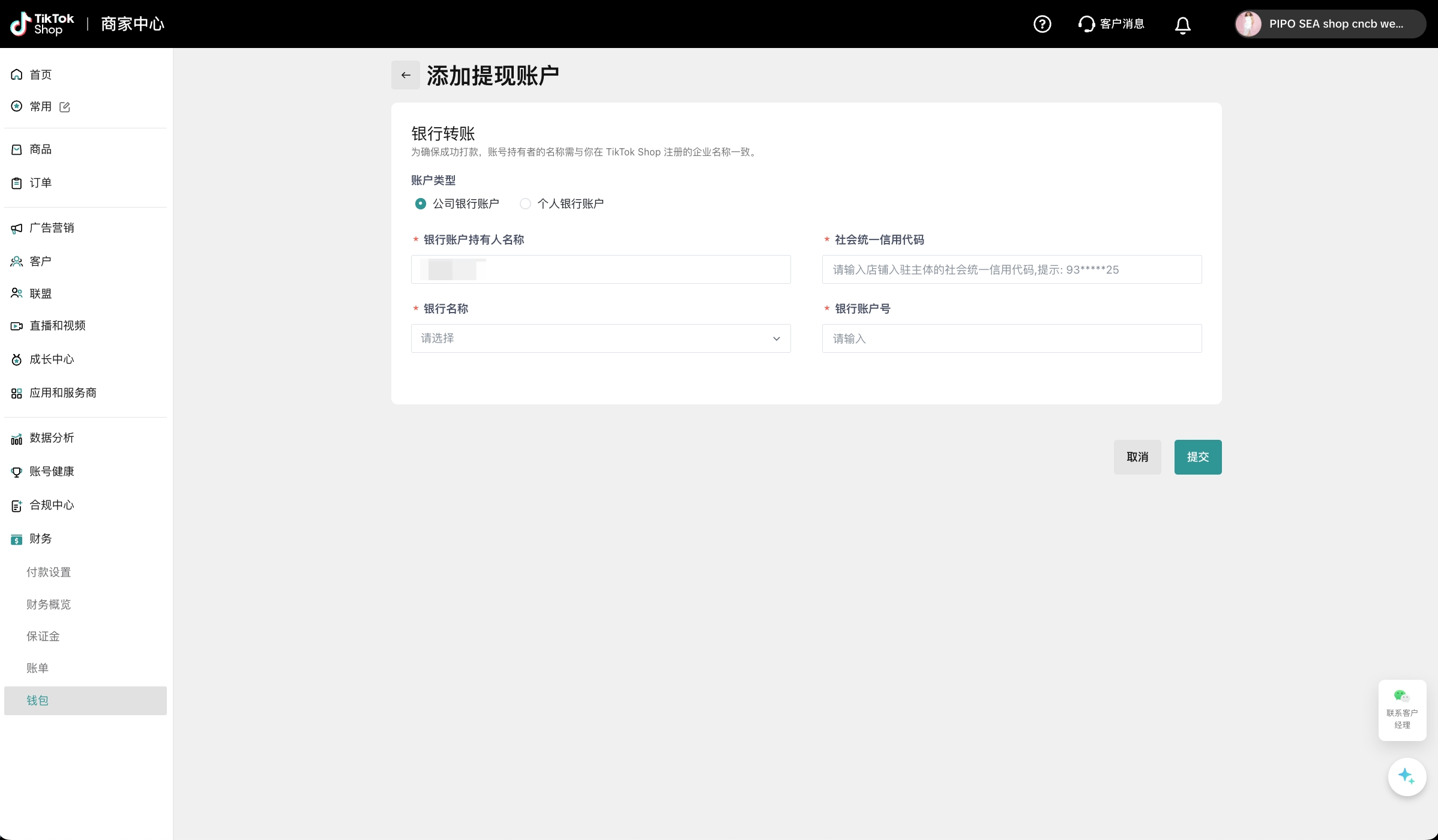 选择银行账户,您需要填写贵司的公账,银行账户持有人名称默认为入驻公司名称;