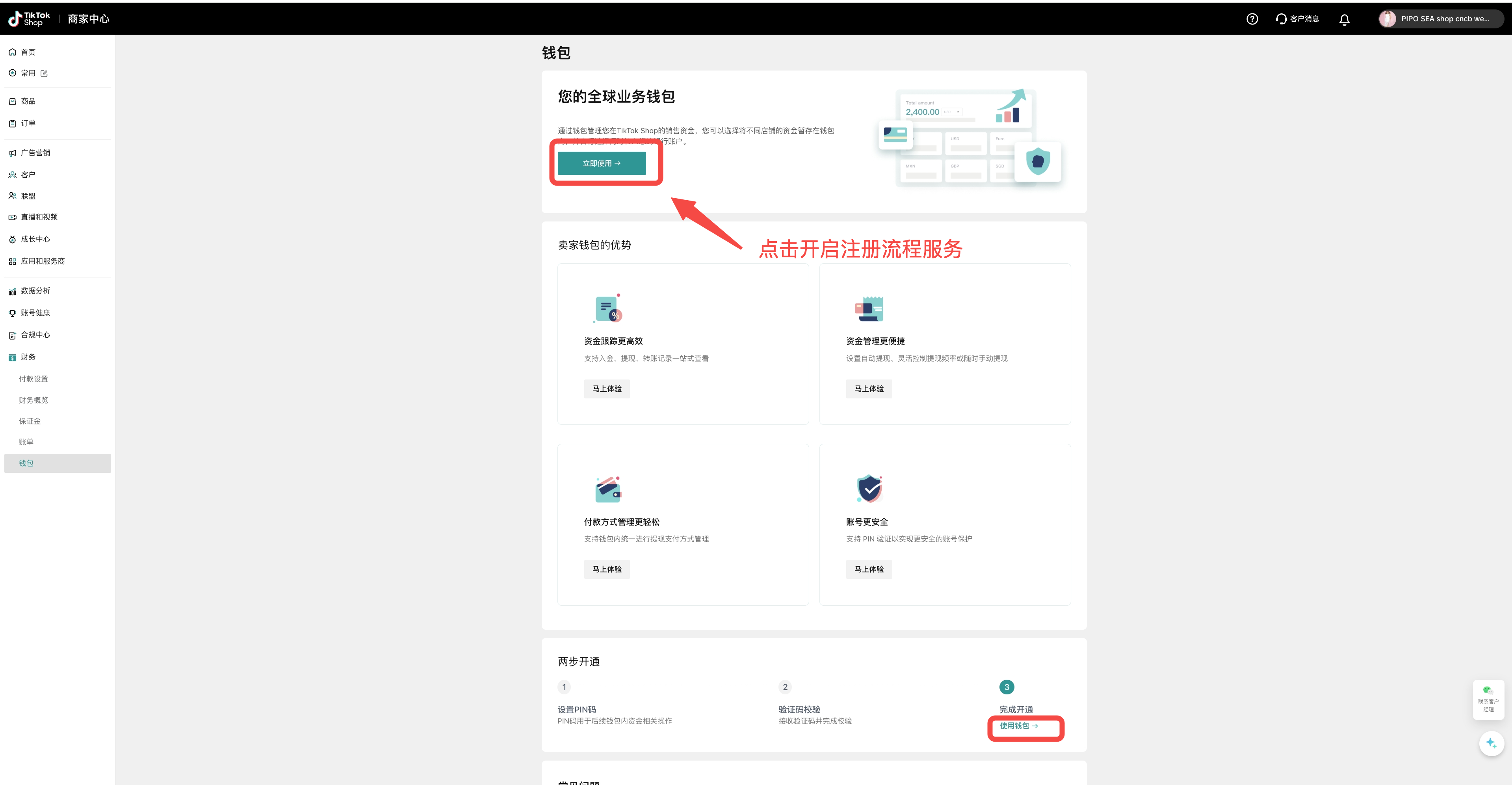 步骤一:登录商家中心 >> 财务 >> 钱包,根据页面指引开始钱包注册服务。
